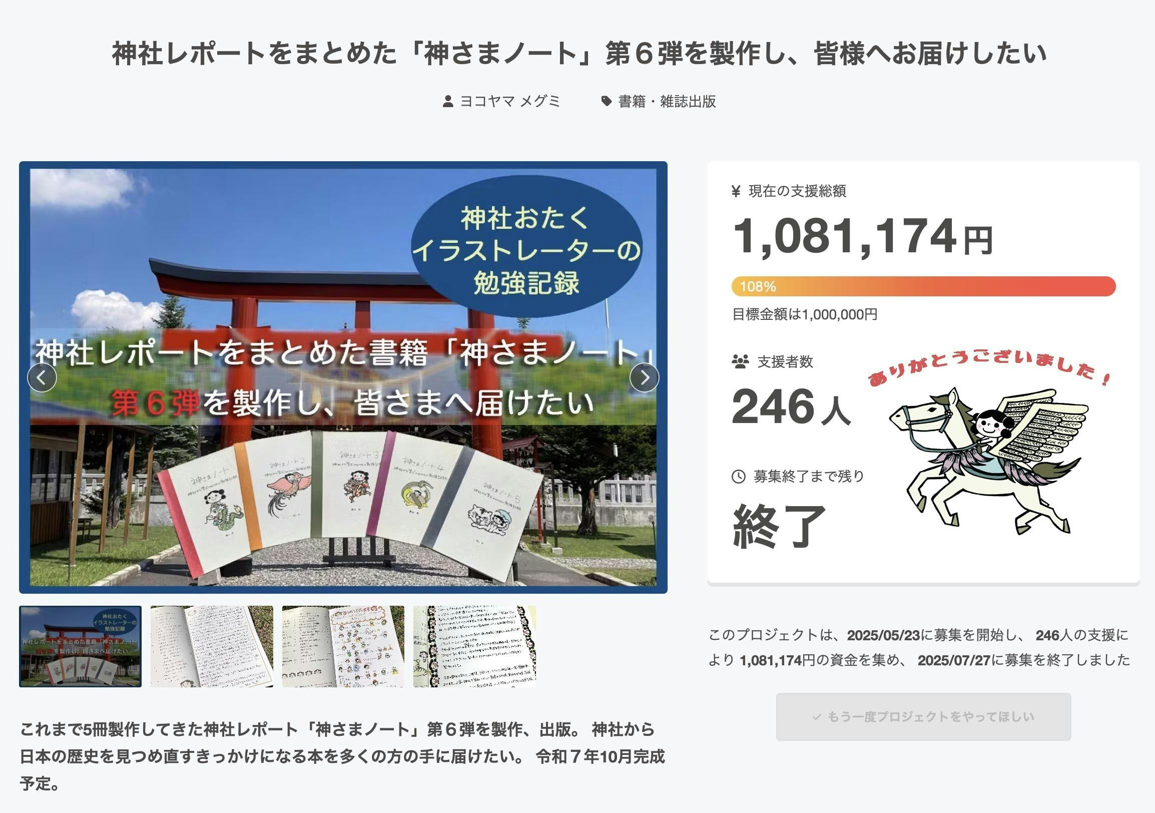初めまして!この度は数多くあるクラウドファンディングのプロジェクトの中から「神さまノート」を見つけてくださり、またご支援までいただき誠にありがとうございます!6冊まとめてお届けいたします。どうか神社巡りのお役に立てたらとても嬉しいです。今後ともどうぞよろしくお願いいたします。