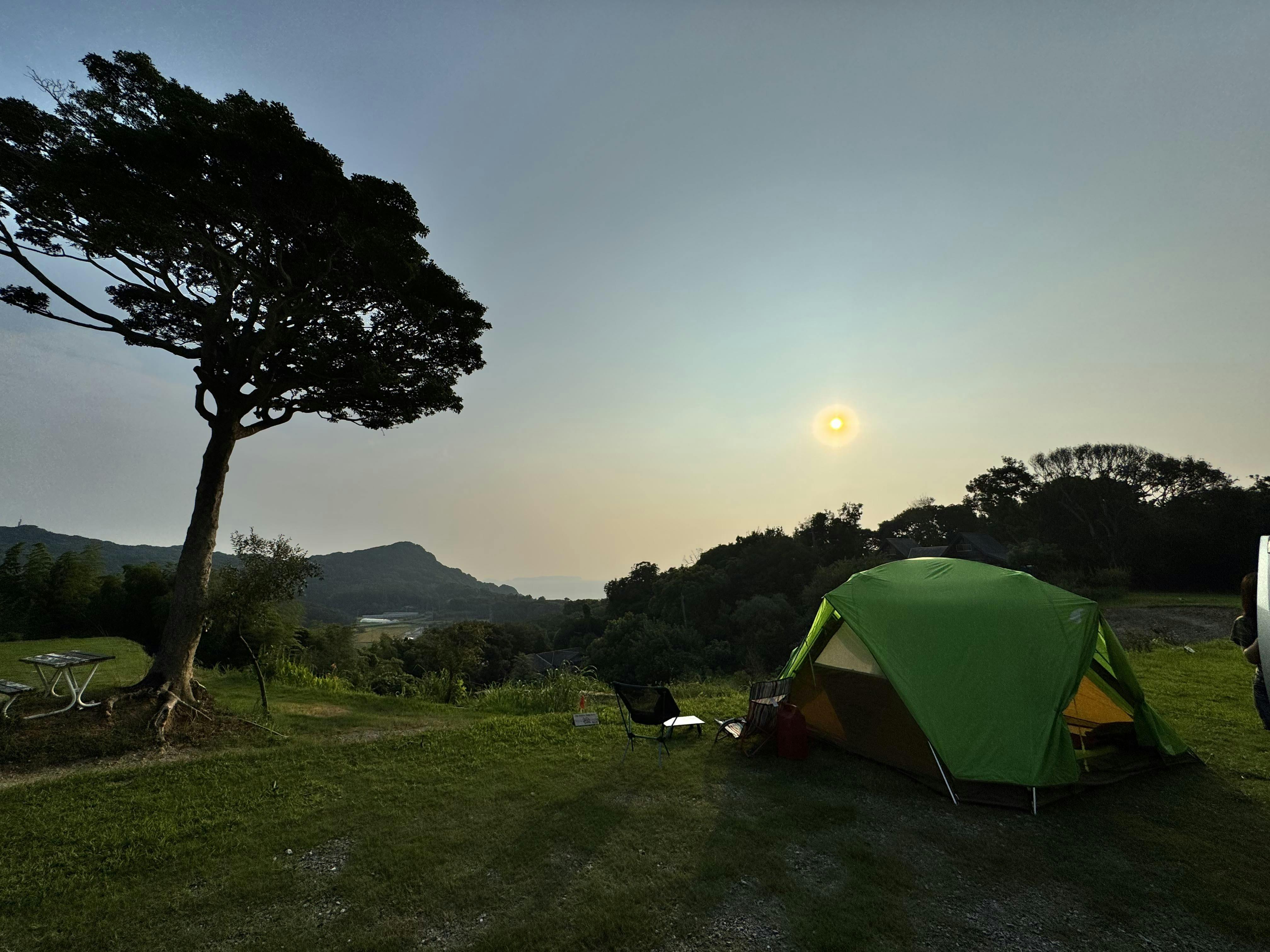 朝は暑さで目が覚めました。夕方は日陰で良かったのですが、テントを設営した場所はちょうど太陽が上がるところでした。