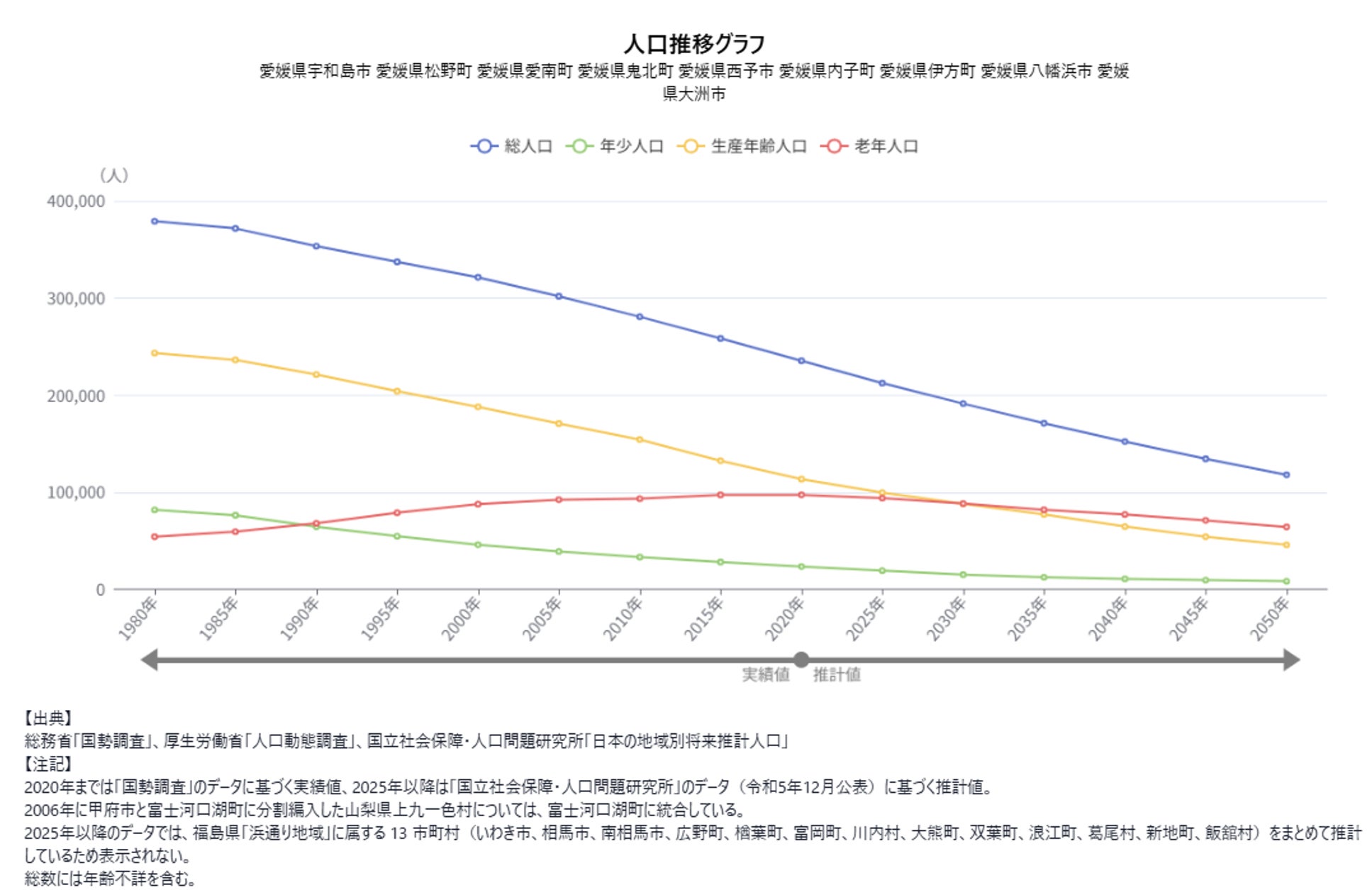 愛媛県南予地方において、2020年(実績値)では約24万人いた人口も、