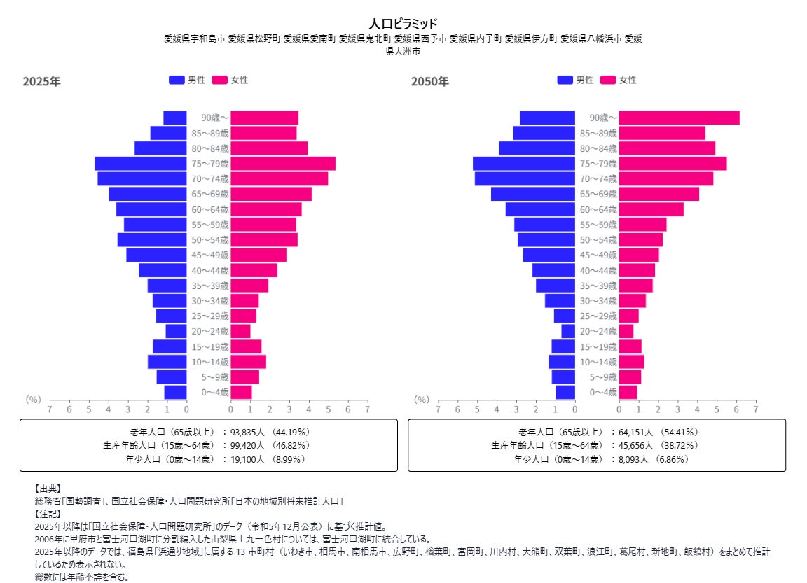 【表2】RESAS(地域経済分析システム)より 愛媛県南予地方(4市5町)の人口ピラミッド