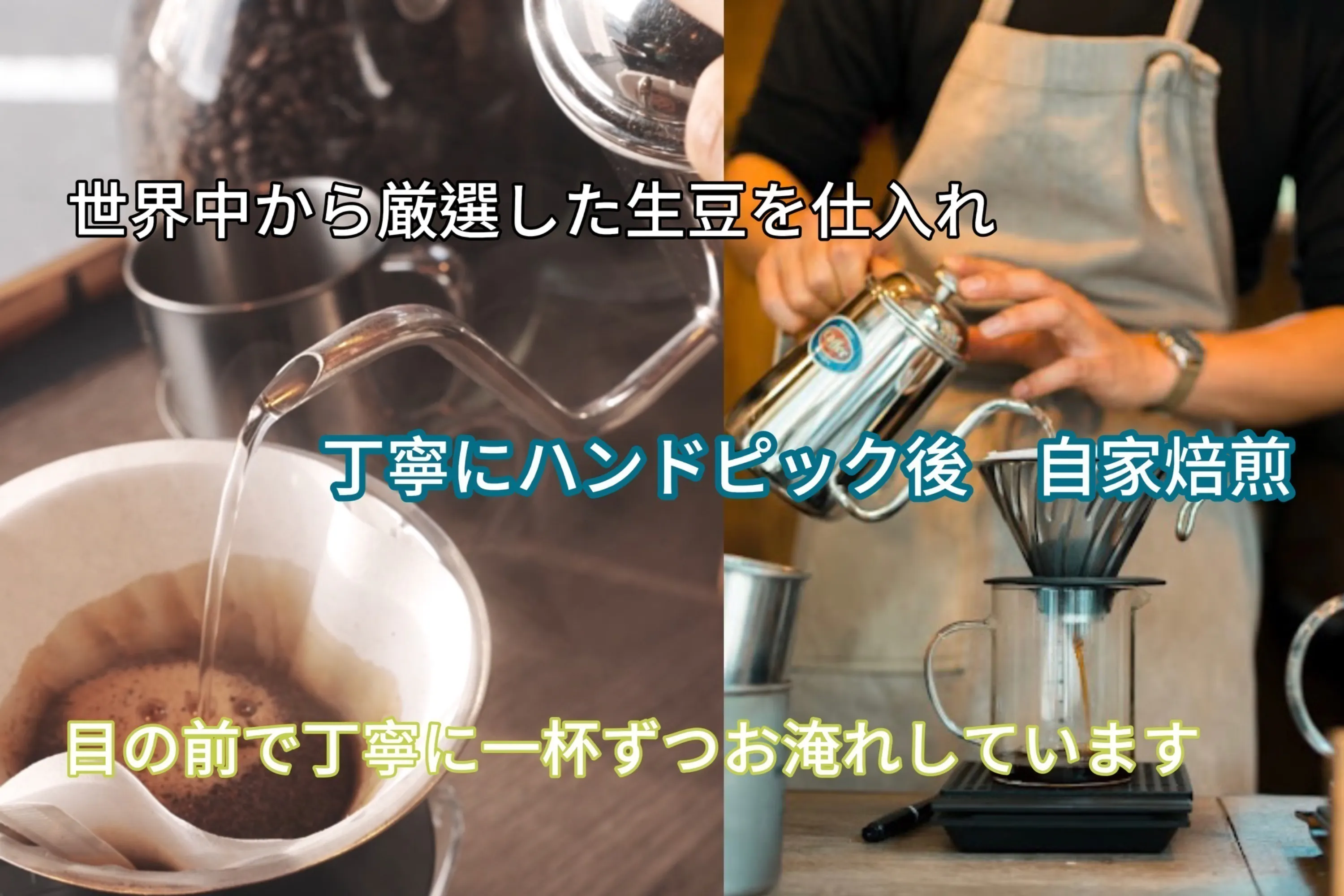珈琲は1杯ずつ淹れたてを提供するハンドドリップ珈琲、豆は世界中から厳選した生豆を全てハンドピックし、ドラム式焙煎機を使って丁寧に焙煎しています。