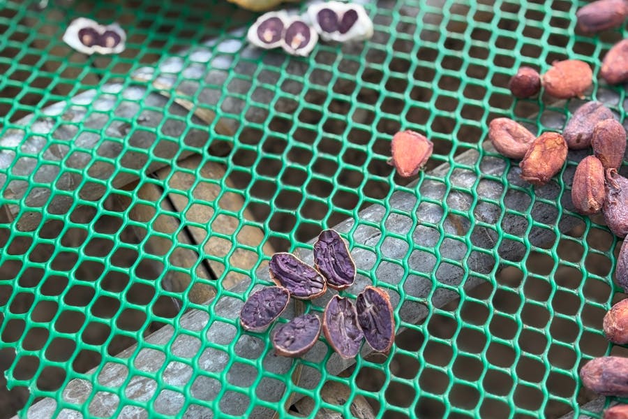 通常、生のカカオ豆はポリフェノールを豊富に含むため紫色をしていますが、乾燥や焙煎によって茶色へと変化し、ポリフェノールの多くが失われてしまいます。