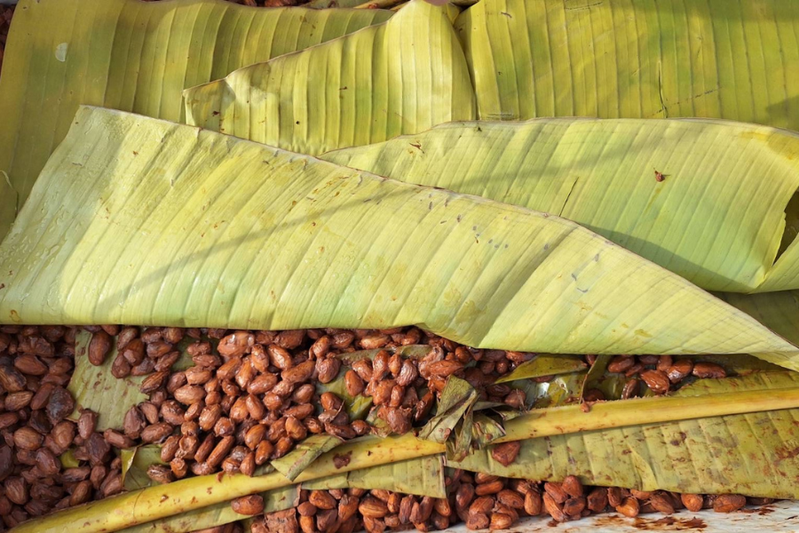 収穫されたばかりのカカオ豆をバナナの葉で丁寧に包み、5〜7日間かけて自然発酵させています。