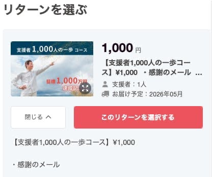 また、今回の1,000万円達成を記念して、より多くの方が気軽に参加できるよう、新たに「1,000円からご支援いただけるリターン」(支援者1,000人の一歩コース)を追加しました。