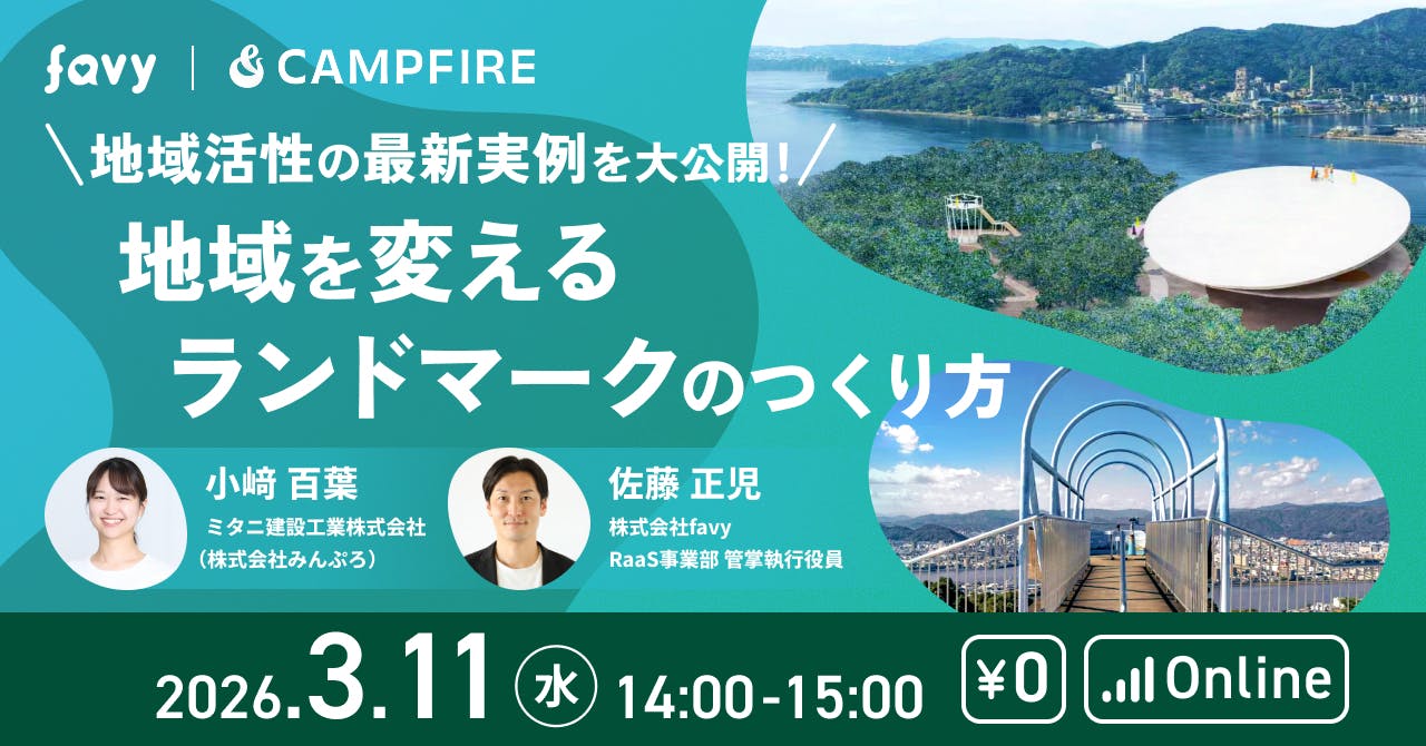 2026/02/27 17:00このたび、『\地域活性の最新実例を大公開!/地域を変えるランドマークのつくり方』と題した、株式会社CAMPFIRE様・株式会社favy様との共催企画に登壇をさせていただくこととなりました。弊社社員・小﨑より、五台山展望台 ソラミアンの構想を事業として立ち上げていくまでのプロセスを、CAMPFIREを活用した事例を交えてご紹介いたします。さらに、株式会社favy様からは、空き物件を「人が集まり続ける場」へと変貌させる『シェア型フードホール』の仕組みについて、成功事例を交えながら伺うことのできる絶好の機会です。「なぜ、五台山展望台 ソラミアンにおいてクラウドファンディングを実践したのか」「クラウドファンディング目標達成のポイントを知りたい」「眠っている資産を収益化し、エリアの価値ごと高めるための不動産活用について知りたい」そういった方々におすすめの内容です。現在、事前のお申し込みを受付けております。「先着順・定員あり」となっておりますので、ご興味のある方は早めにお申し込み下さい!ーーーーーーーーーー◆開催日時:2026年3月11日(水)14:00〜15:00◆参加形式:オンライン(Zoomウェビナー)◆参加費用:無料◆内容:14:00〜 第1部(弊社 登壇 ※その後第4部まで在籍しております)官民連携による地域ランドマーク建設プロジェクト事例で トークセッション14:35〜 第2部(株式会社favy様 登壇)地方の空き物件も“地域のランドマーク”へ。 「シェア型フードホール」による遊休資産再生術14:50〜 第3部(株式会社CAMPFIRE様 登壇)参加者特典(クラウドファンディング企画書作成サービス)のご案内14:55〜 第4部アンケート・質疑応答▼詳細・お申し込みはこちらから▼https://camp-fire.jp/form/favy_20260311皆さまのお申し込みを、心よりお待ちしております。 もっと見る