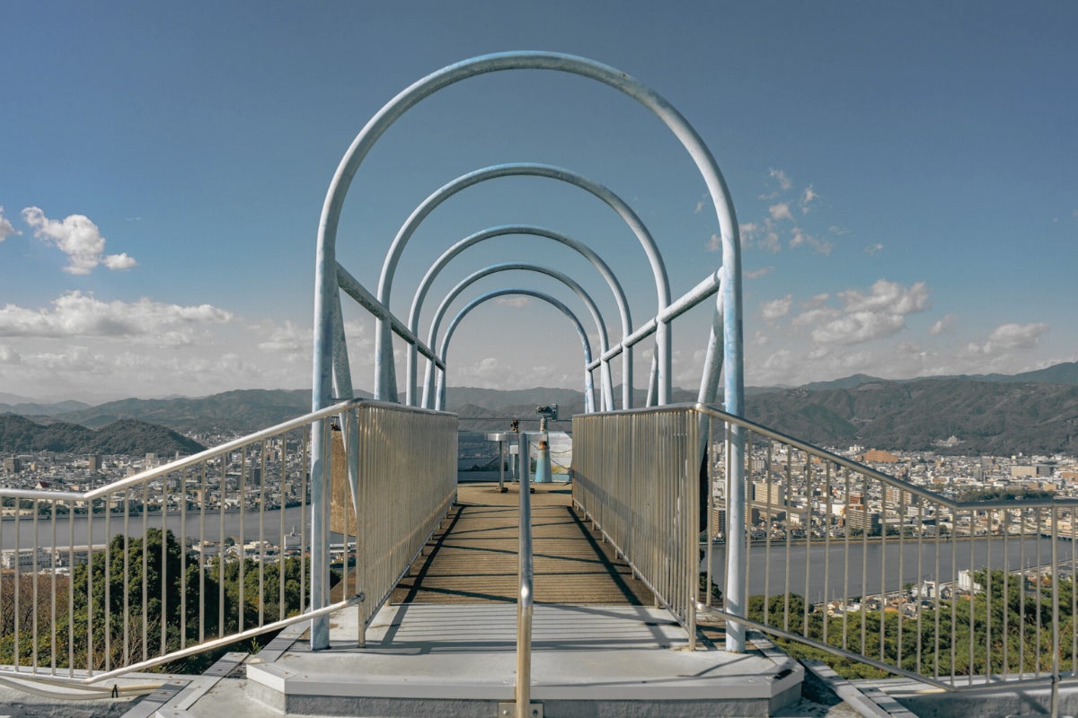 象徴的なアーチをくぐり抜けた先に広がる、高知市街の美しい風景(旧展望台)