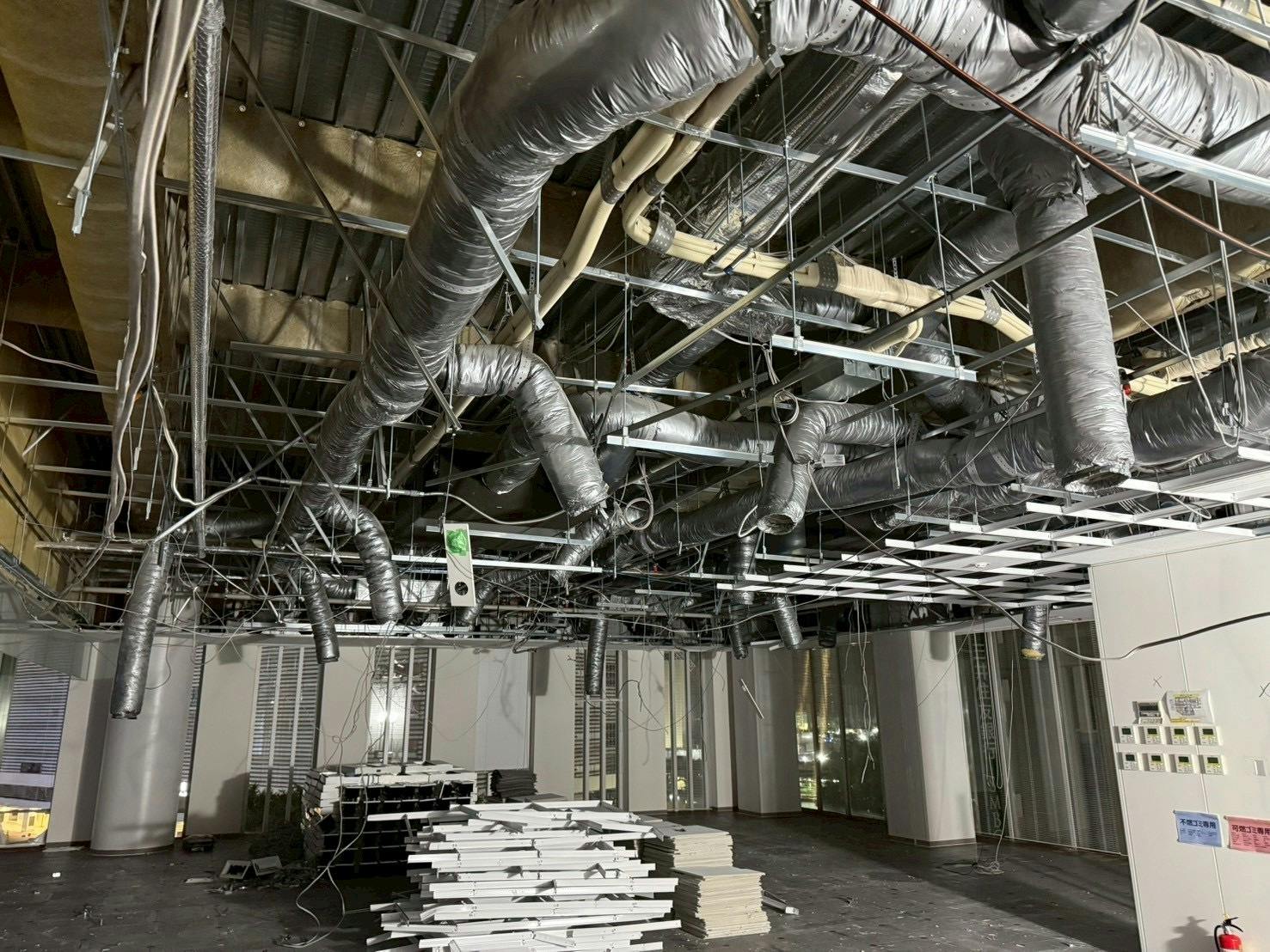 初日の7月1日は、工事全体に必要な共通仮設工事を実施。続く7月2日からは、システム天井の解体工事に入りました。