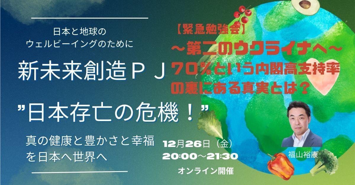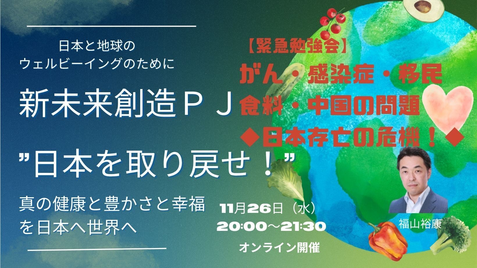 こんにちは。福山です。トランプ大統領のベネズエラへの攻撃・支配戦略・・・そして、グリーンランド獲得への動き・・・世界は何でもありの秩序なき世界へと突入してしまいました。さらには、日本は、解散総選挙でグローバリストに操られる世界へと益々加速しており、政界では、立憲民主党の解体で公明党への吸収合併での新党“中道改革連合”の結成と酷い状況へと陥っています。このような日本と世界の混沌とした状況において、私たち庶民にできることは何なのでしょうか?まず大事なのは、今ある世界のありさまを正確に把握していくことです。世界は、一極支配から二極支配そして、これから、多極化という混沌の世界へと突入しようとしています。今回の勉強会では、まずこの世界のありようをわかりやすく整理していきます。その上で、この世界に置かれた日本は、どのような状況にあるのかということも明らかにしていきます。その上で、私たちが取り組んでいくべきことについて、具体的な提案として掲げていきます。喫緊でお願いしたいのは、立憲民主党の原口一博衆議院議員が立ち上げた “ゆうこく連合”を支援していくことです。ゆうこく連合の結党については、記者会見をしていますので是非ご覧ください。 https://www.youtube.com/live/0zbaZ1AFS0A?si=RFjY7lAvS-kUz7Flゆうこく連合についてはこちらをご覧ください。 https://ukoku.work/ ゆうこく連合の基本理念が、 日本再生・日本独立・日本救世です。新未来創造PJは全面的にゆうこく連合を全面的に支援していきます。詳しくは、1月28日開催の緊急勉強会で具体的にお話していきますので是非ご参加ください。お申込み詳細はこちらから https://peatix.com/event/4821558/view