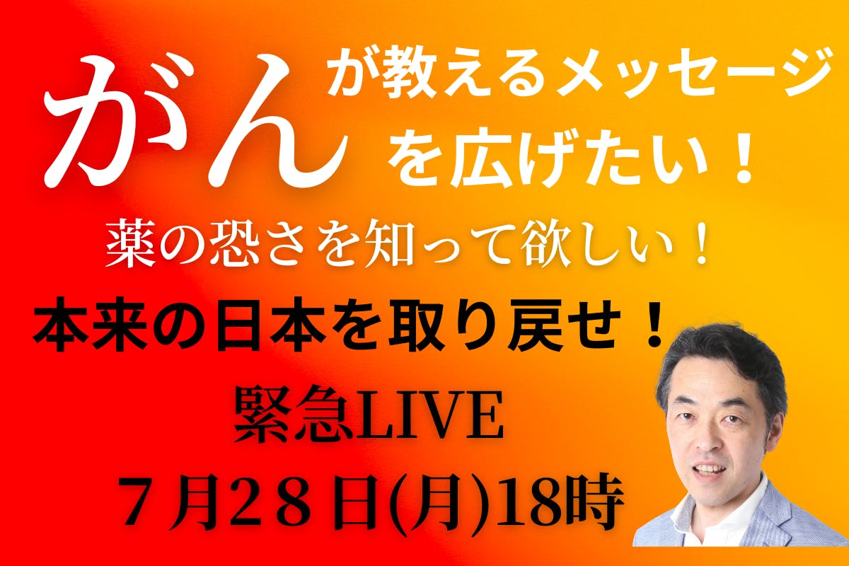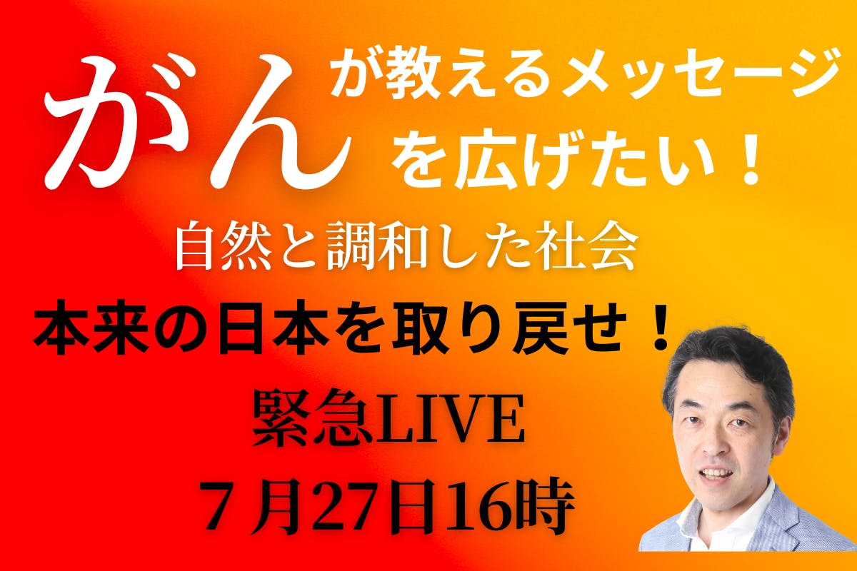 こんにちは。福山です。がん予防クラファン!がんで悲しむ人を一人でも減らしたい!は、残すところあと3日となりました! https://camp-fire.jp/projects/846776/view 7月31日で終了です。明日は、 “ストレスの本質を知って欲しい!”というテーマでLIVE配信します。 7月29日(火)18:00~ https://fb.me/e/7cocLpvM2 今回のクラファンのメインテーマは、 “がんが教えてくれるメッセージを広めたい!”それは、何を意味するのかと言えば、それは、 “本来の自分を取り戻す!”ことであり、更に言えば、 “本来の日本を取り戻す!”ということ。そして、本来の日本を取り戻すための施策が、 “エコビレッジの創設と拡大”なのです。現代の子どもたちや若者は、 “日本の未来に希望がない!”という思いを抱え、なんと幸福度調査では、 “世界ワースト2位”という最悪の事態に陥っているのです。このようなことで、本当に日本はいいでのしょうか?なぜ、日本はこのような事態に陥ってしまったのでしょうか?それを明らかにしていくのが、今回出版する書籍 “がんが教えるメッセージを受け取って”であり、その解決策が、エコビレッジの創設拡大なのです。そして、日本人がもともと持っていた精神性を取り戻すということであります。日本人の伝統的な強い精神性をとりもどすということです。そこについては、明日7月29日(火)18時~LIVEで、お伝えしていきます。 “ストレスの本質とは?” “日本人の精神性とは?”についてお伝えしていきます。それは、エコビレッジに繋がっていくものでもあるのです。 “本来の日本を取り戻せ!”それが、がん予防にも明るい希望ある日本の再生にも繋がっていくものなのです。もう、政治による拡大成長経済政策は不要なのです。明日、7月29日(火)18:00~のLIVE配信で詳しくお話していきたいと思います。是非、LIVE配信を視聴ください。 https://fb.me/e/7cocLpvM2 そして、クラウドファンディングの応援・シェアは、どうぞこちらからよろしくお願いいたします。https://camp-fire.jp/projects/846776/view