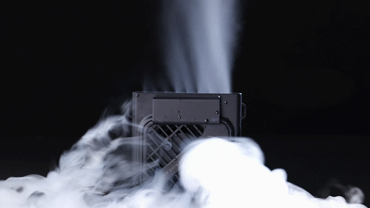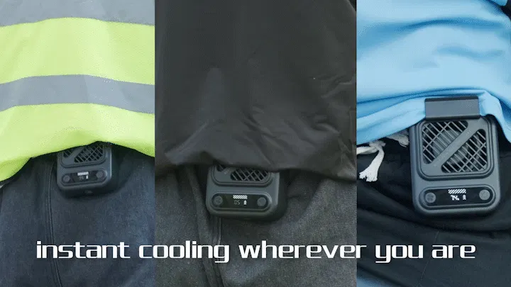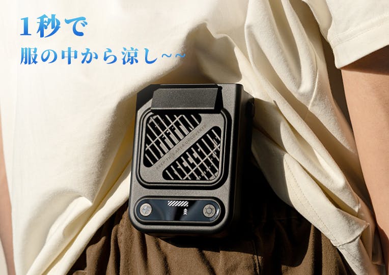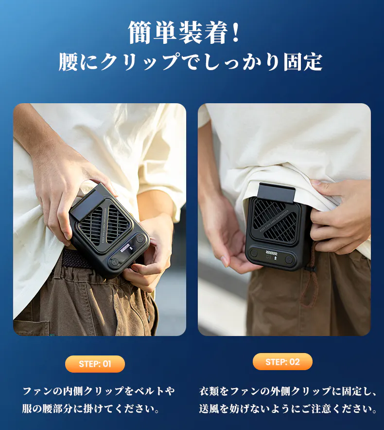 ベルトや服の腰部分に掛けて、空調服のように服の中に送風できます。