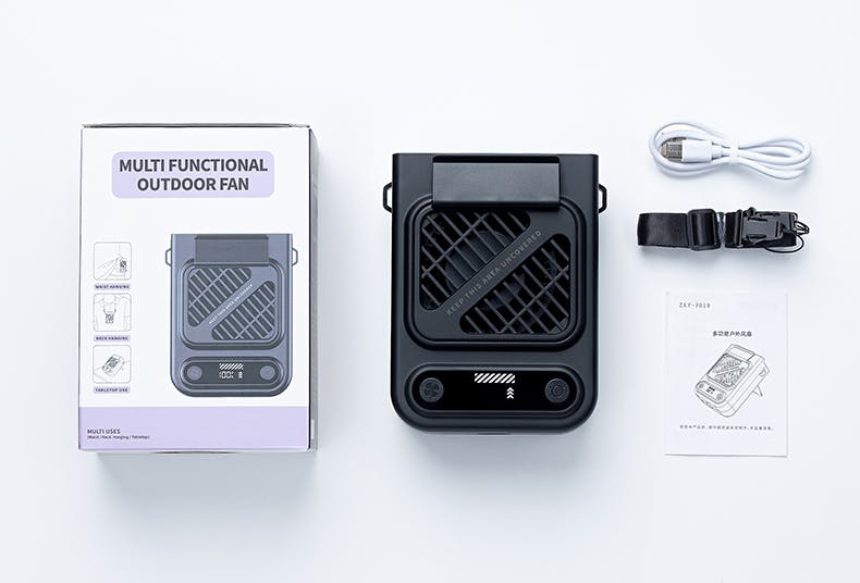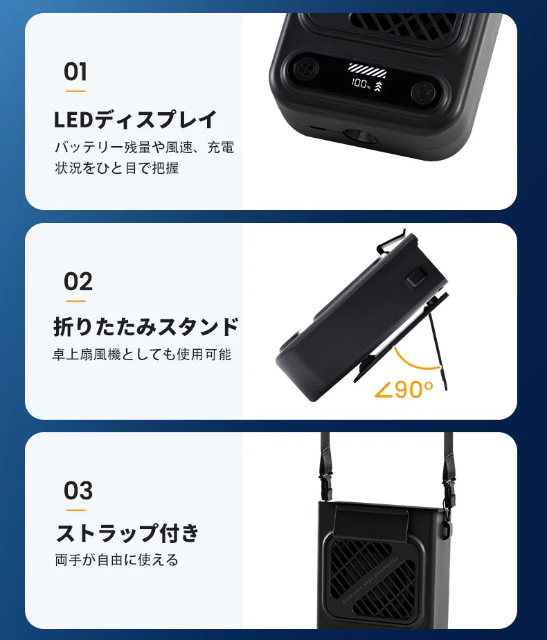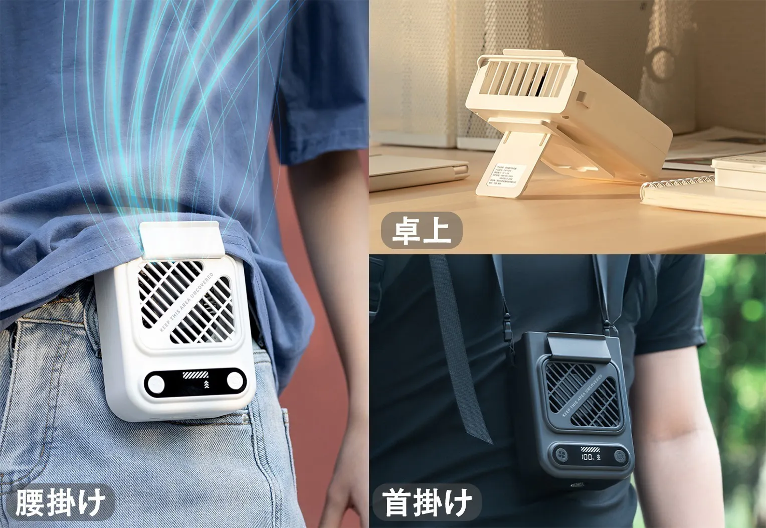 腰・卓上・首掛けの3WAY設計で、両手が自由に使え、どこでも快適に涼しさを楽しめます。