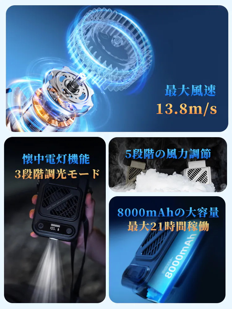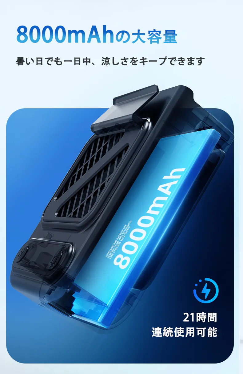 8000mAhの大容量バッテリーを搭載し、最長21時間の連続稼働が可能。暑い日でも一日中、涼しさをキープできます。