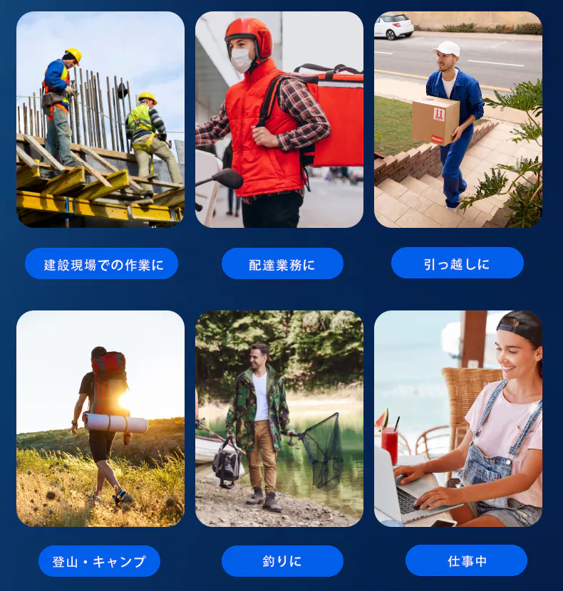 両手が自由に使えるため、登山や釣りなどのアウトドアはもちろん、工事現場や警備業務、宅配・デリバリー、畑仕事、厨房での作業、自転車での通勤・通学など、さまざまなシーンで活躍します。