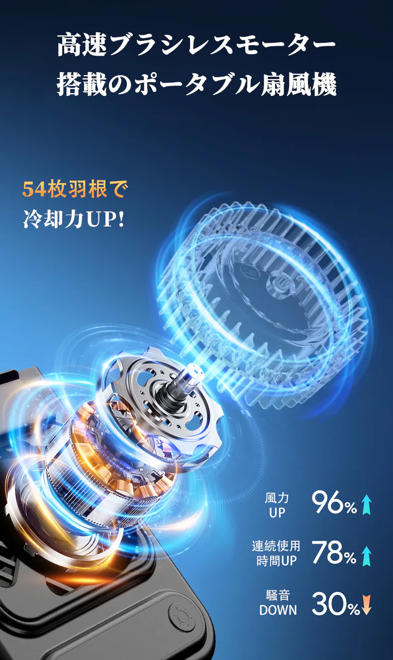 最新の高速ブラシレスモーターを搭載し、風速13.8m/sという圧倒的な超強風力を実現。低騒音設計かつ高い耐久性により、パワフルな送風を長時間安定してお届けします。