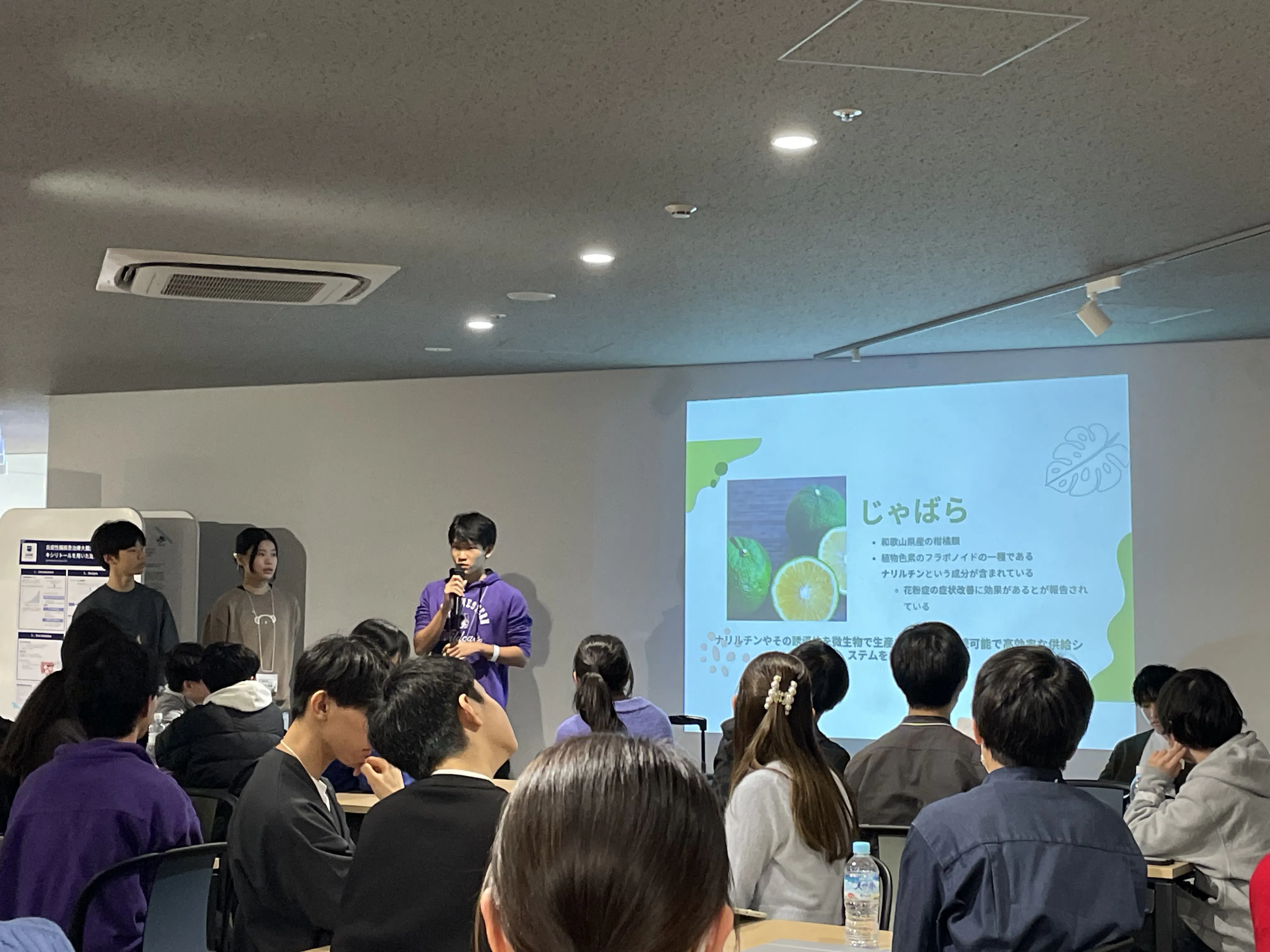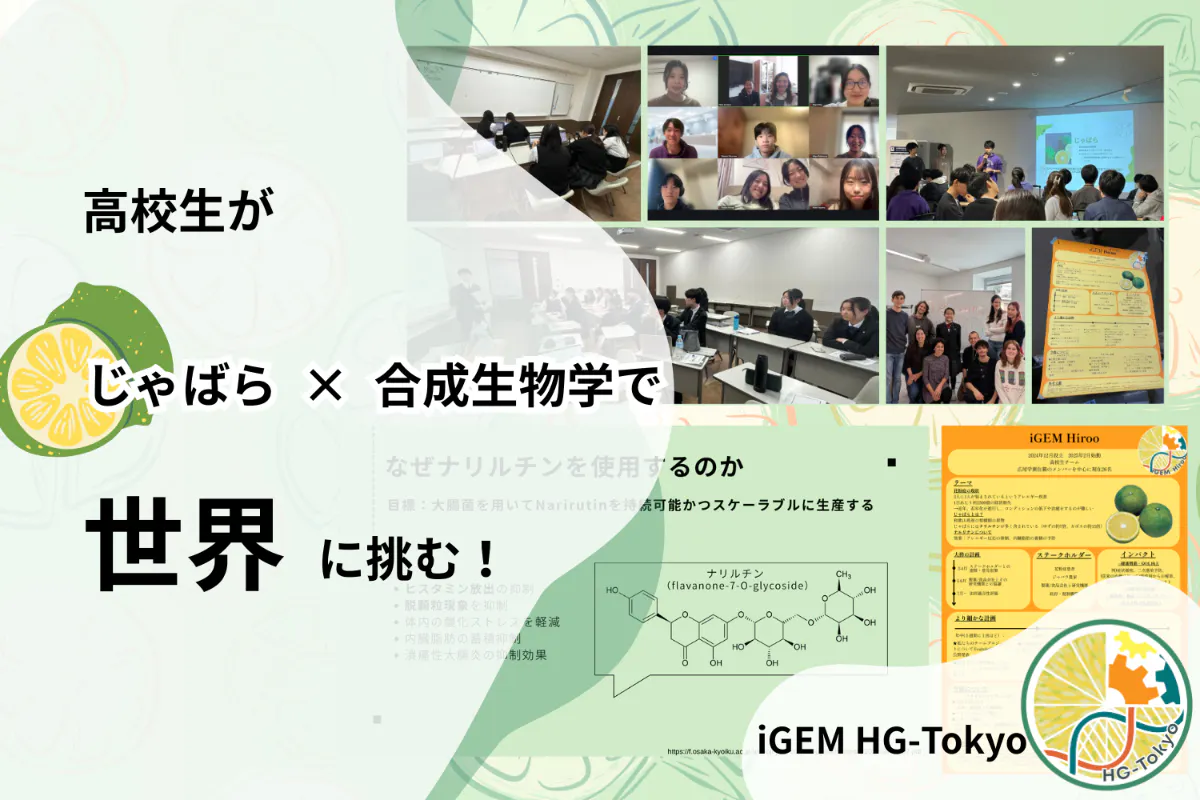 現在、日本において花粉症は「国民病」とも言われるほど深刻な問題となっています。環境省が2022年に実施した調査では、国民の約3人に1人がスギ花粉症に罹患しているという結果が示されました。また、パナソニック株式会社が2025年に発表した推計によれば、花粉症による経済的損失は1日あたり約2,320億円にのぼるとされています。さらに、海外においても、イギリスではイネ科花粉によるアレルギーが深刻化している実態があります。このように近年、花粉症の問題は顕在化しており莫大な被害を発生させています。そんな中、私たちは和歌山県北山村の特産品であるじゃばらという柑橘類に着目しました。この果物にはナリルチンというフラボノイドが多く含まれており、抗アレルギー作用があることが先行研究で知られています。しかし、じゃばらは特定の地域でしか栽培されておらず、ナリルチンを大量に供給し、より多くの人の症状の改善が厳しいのが現状です。そのため、私たちは合成生物学を利用し、ナリルチンを微生物の力で大量生産をするプロジェクトを立ち上げました。具体的には、大腸菌や酵母などにナリルチンの生合成経路に必要な遺伝子を導入し、発酵プロセスでナリルチンを生産させることを目指しております。