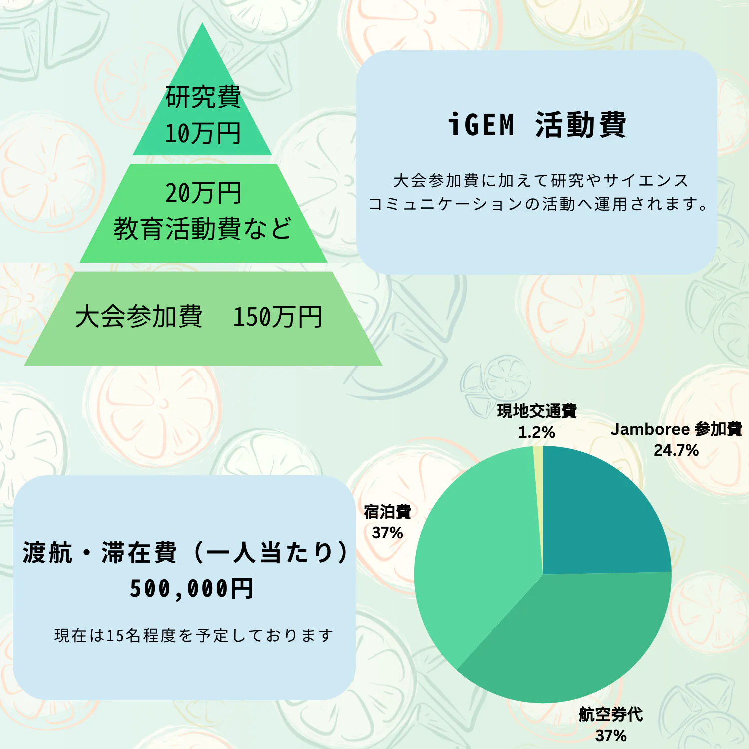 iGEMへの参加には、150万円をこえる大会参加費、メンバーの渡航費、教育活動費、研究費など、多額の資金が必要です。