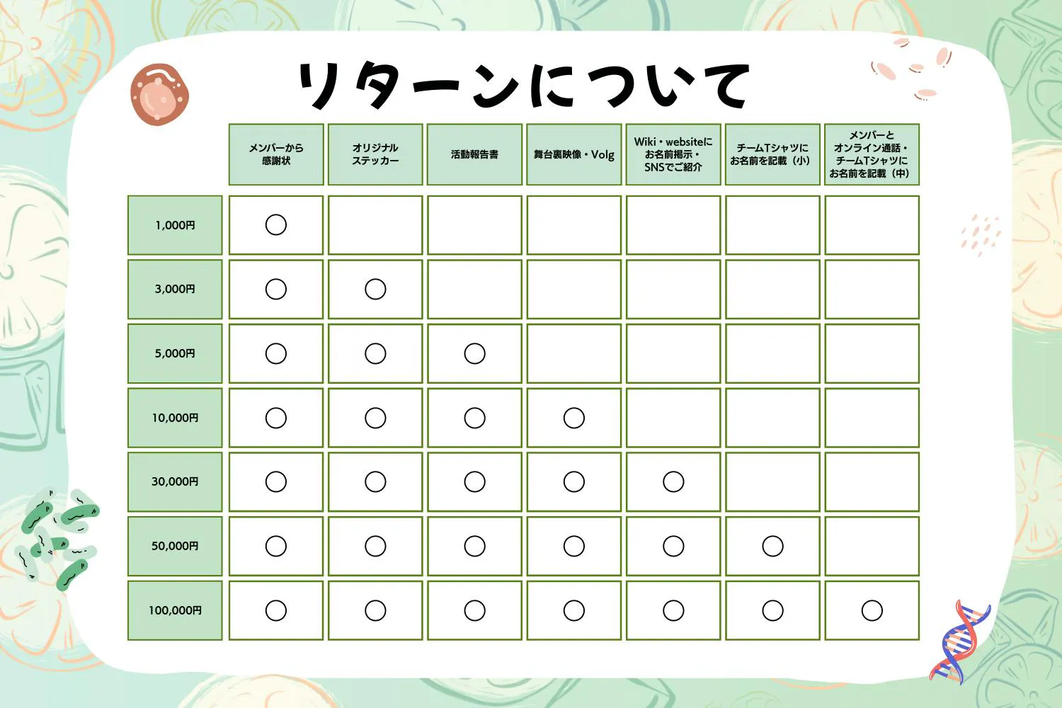このプロジェクトに共感し、ご支援いただける皆様に、感謝の気持ちを込めてリターンをお届けいたします。上記の図のように、金額が上がるごとにリターンが積み重なります。サイズアップのものに関しましては、大きいものが適応されます。