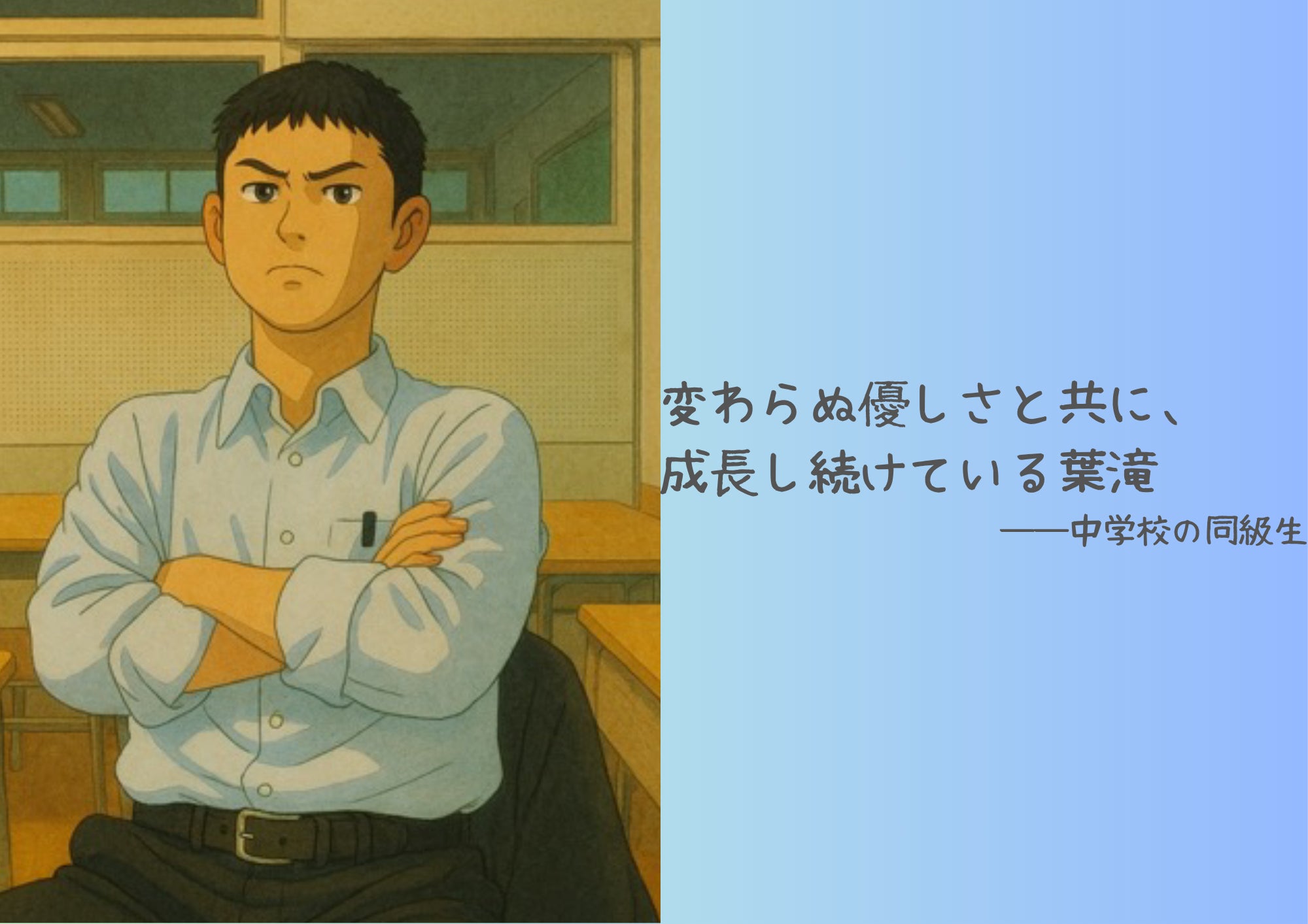帰省のたびに会う葉滝は、中学生の時は小さかった体も大きくなり、人間としても成長している姿を見て、変わらぬ優しさと共に成長し続けていることを感じます。