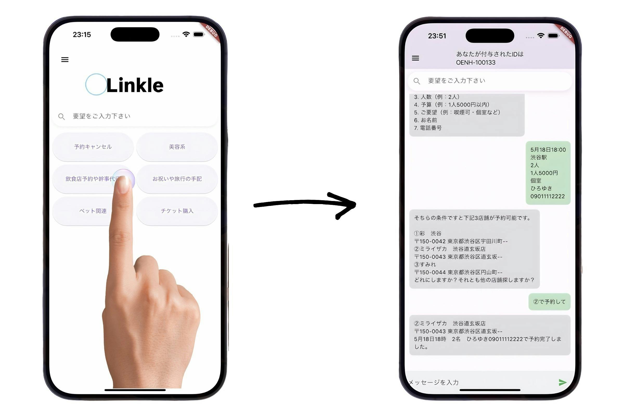 お店の名前・日時・予約者名を伝えるだけで、Linkleが代わりに連絡・キャンセル処理を行い、完了報告までしてくれます。