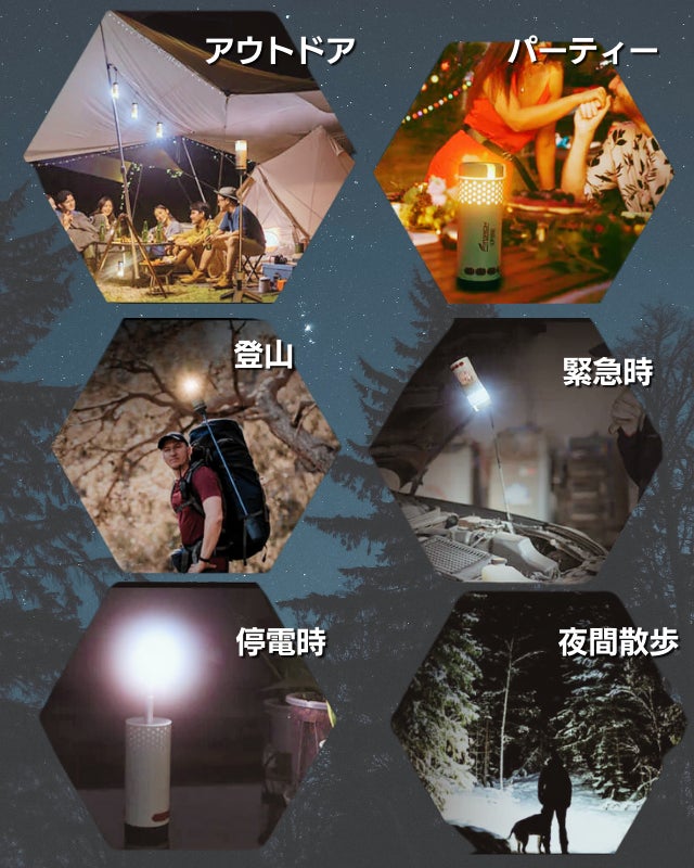 広角照明でキャンプサイトを明るく照らし、照明モードの切り替えで様々な雰囲気を楽しめます。