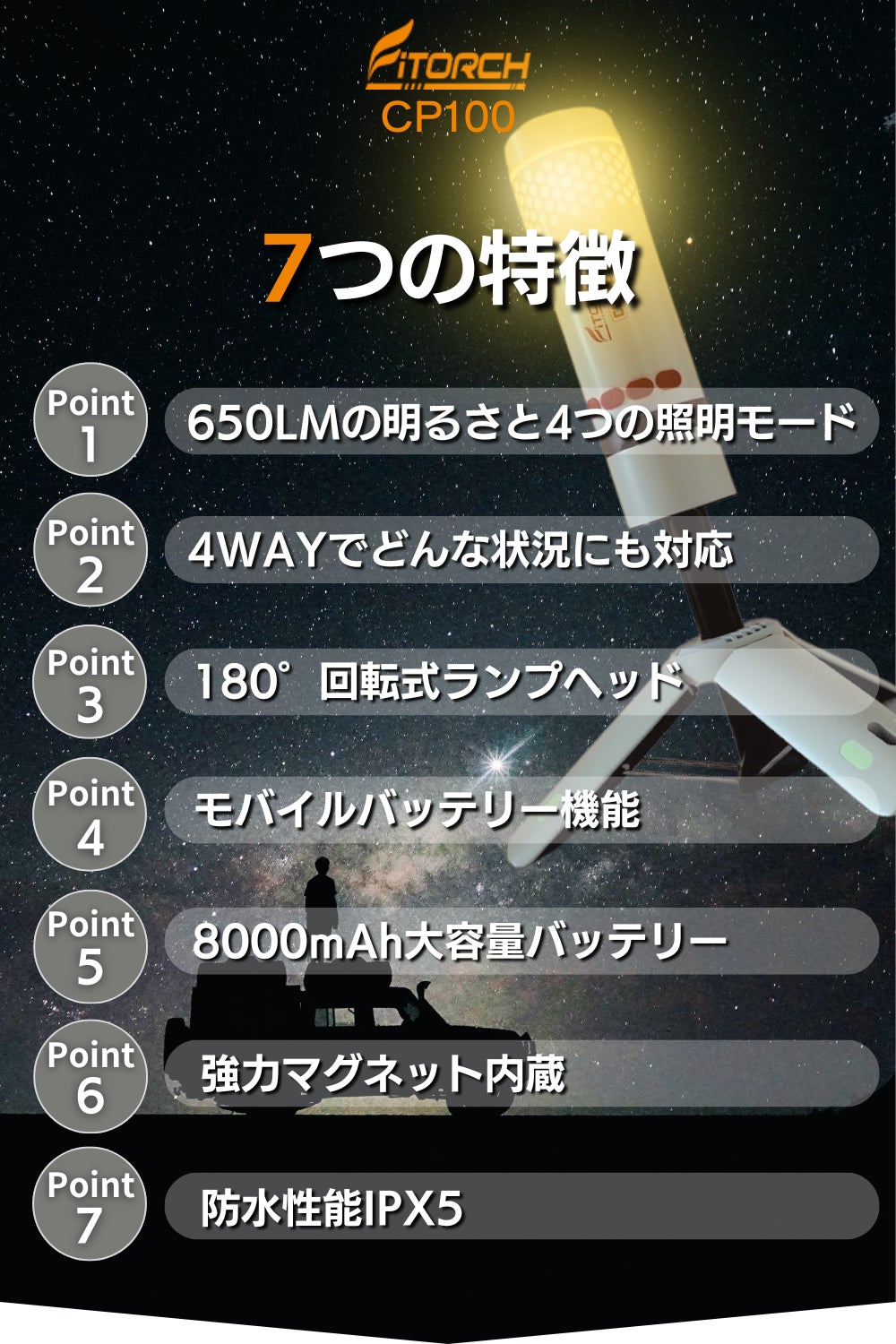 FITORCH(Fine & Fitの意味)では、お客様に「現実的、革新的、心のこもったサービス」を提供することを使命としており、今回、日本の皆様に当社最新作の「CP100」をご紹介出来ることを楽しみにしております。CP100は、ただのライトではありません。それは、あなたの生活をサポートし、日々の充実感を与えてくれる「信頼の相棒」です。災害時の備えに、アウトドアの楽しみに、そして普段使いに。どんなシーンでもあなたを支えるCP100をぜひお試しください!