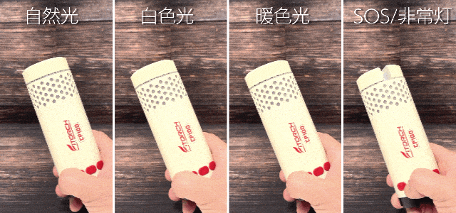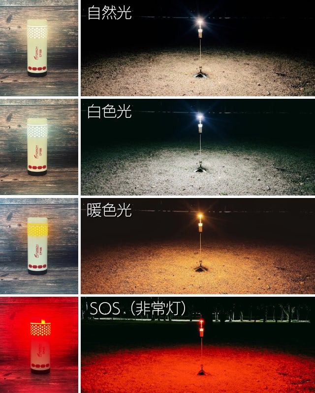 4つの照明モード:自然光、白色光、暖色光 + SOS(非常灯)