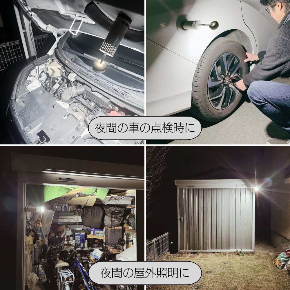 夜間や暗いガレージでも十分な明るさを確保し、効率的に作業可能。三脚、マグネット設置で、両手を使って作業が可能。