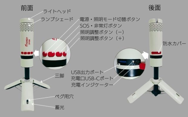CP100の三脚には蓄光とペグ固定用穴が付いておりますので暗闇や不安定な場所でも使えて野外活動では大変役立ちます。