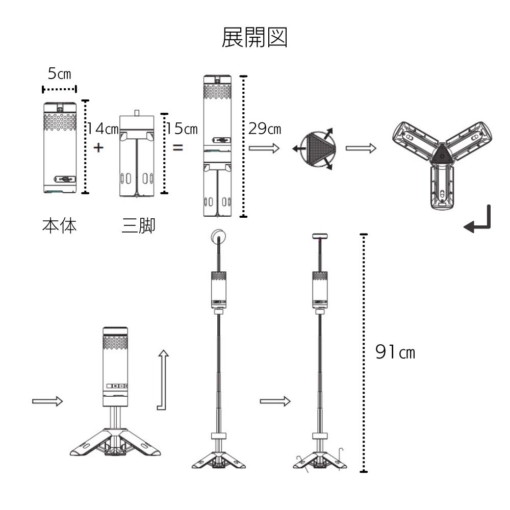 最大91㎝、高さを自由に調整できる伸縮ポールで、高い場所や広い範囲をしっかり照らします。コンパクトにどこにでも持ち運び可能。キャンプから災害時まで、状況に応じた使い方ができます。