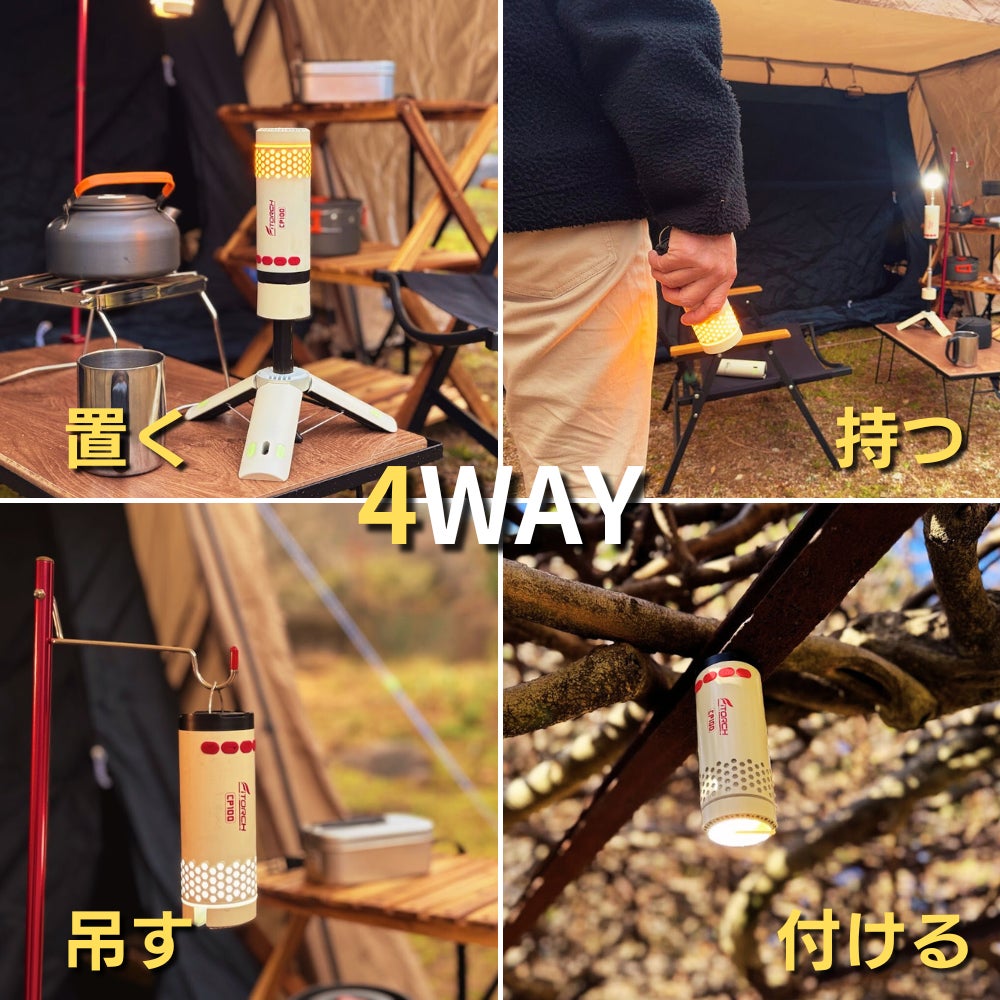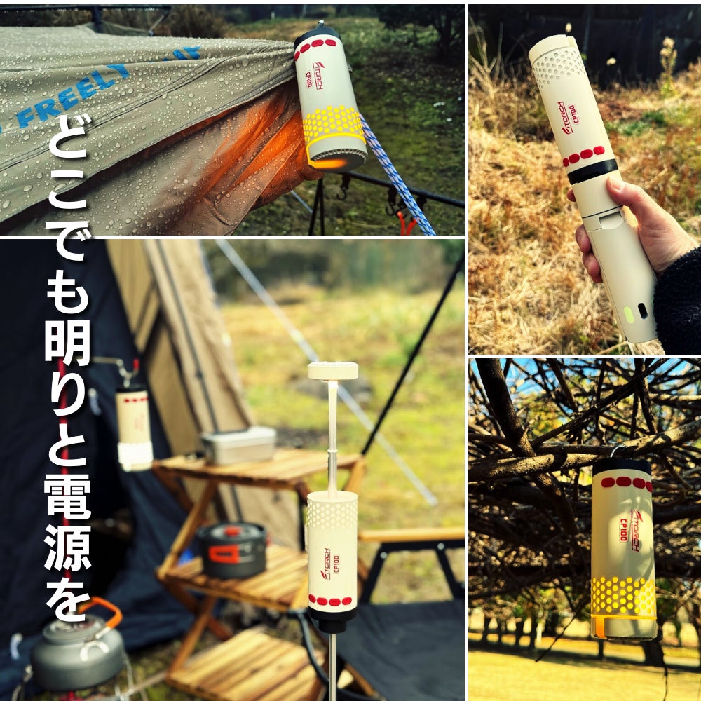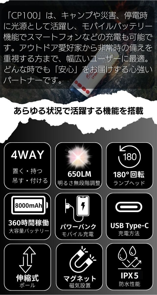 「CP100」一つでキャンプランタン、卓上ライト、懐中電灯、撮影照明などマルチに使い分けが出来てあなたの生活をサポートします。