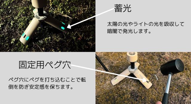 CP100の三脚には蓄光とペグ固定用穴が付いておりますので暗闇や不安定な場所でも使えて野外活動では大変役立ちます。