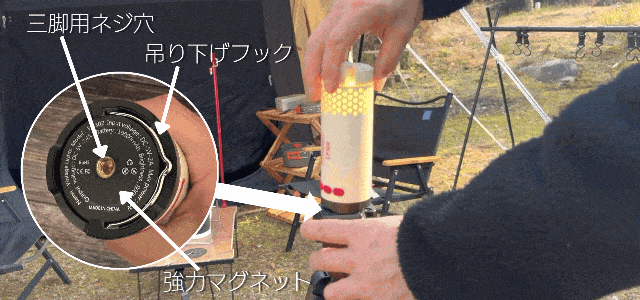 『吊す』:吊り下げフック付きでランタンスタンドや枝に簡単に吊り下げ可能。