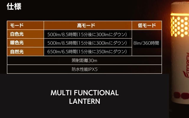 広範囲を広角に明るく照らすランタンモードと遠くまで高照射で照らす懐中電灯モードにより1台であらゆる状況に対応します。