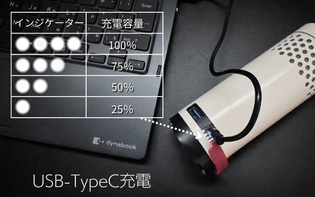 USB-TypeC充電:インジケーターで充電状況が一目で分かり過充電を防ぎ経済的。