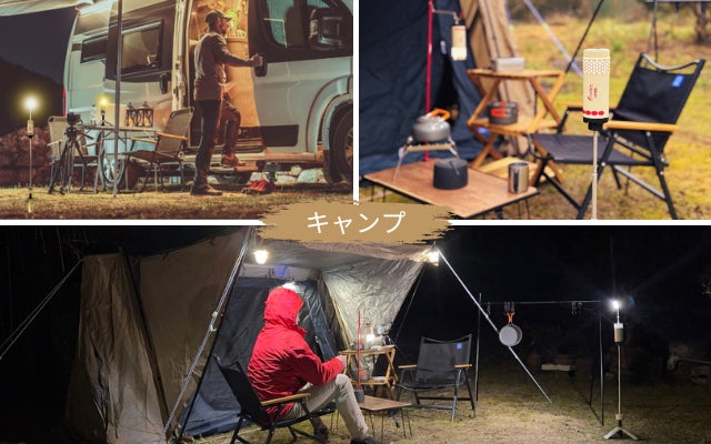 広角照明でキャンプサイトを明るく照らし、照明モードの切り替えで様々な雰囲気を楽しめます。