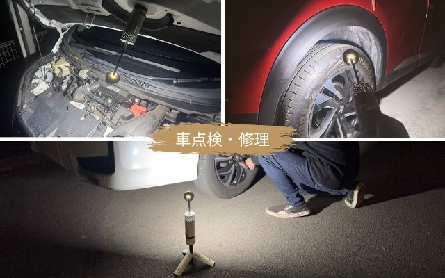 夜間や暗いガレージでも十分な明るさを確保し、効率的に作業可能。三脚、マグネット設置で、両手を使って作業が可能。