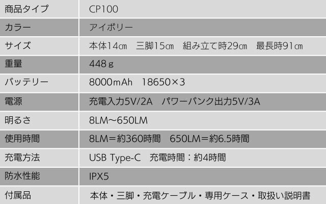 CP100は、8000mAhの大容量バッテリーを内蔵しており、照明としてだけでなく、スマートフォンやタブレットなどのデバイスを充電できるモバイルバッテリー機能を備えています。