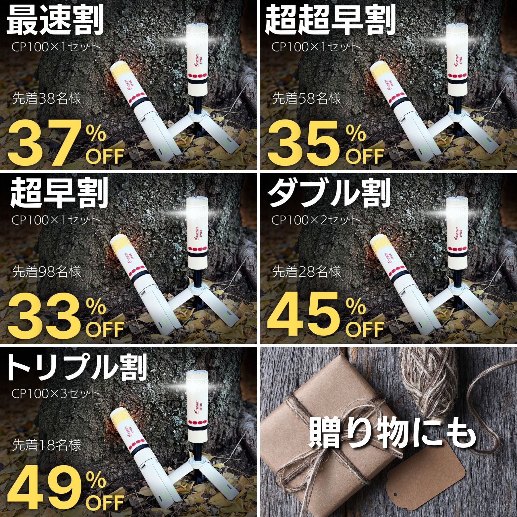 今回、FITORCH「CP100」を特別価格にてご提供させて頂きます。私自身、アウトドアやキャンプが大好きで、また災害時の備えの重要性も強く感じています。その中で「アウトドアや日常、非常時まで、どんなシーンでも頼れるライトがあったら便利だろう」と思うようになりました。そこで着目したのが、「明るさ」「便利さ」を兼ね備えたライトの必要性です。この「CP100」。アウトドアでも日常でも使える究極のライトを、ぜひ皆さまにお届けしたいと考えています。CP100が一つあれば日常生活からキャンプ、アウトドア、防犯、災害時の備えにもなり、自信をもってお勧めします。実用性が有り、緊急時にも役に立つ「CP100」を皆様にお届け出来るのを楽しみにしております。是非一生もののお供としてあなたの側に置いていただけたら幸いです。精一杯プロジェクトに取り組んで参ります。皆様からのご支援を心よりお待ちしております。
