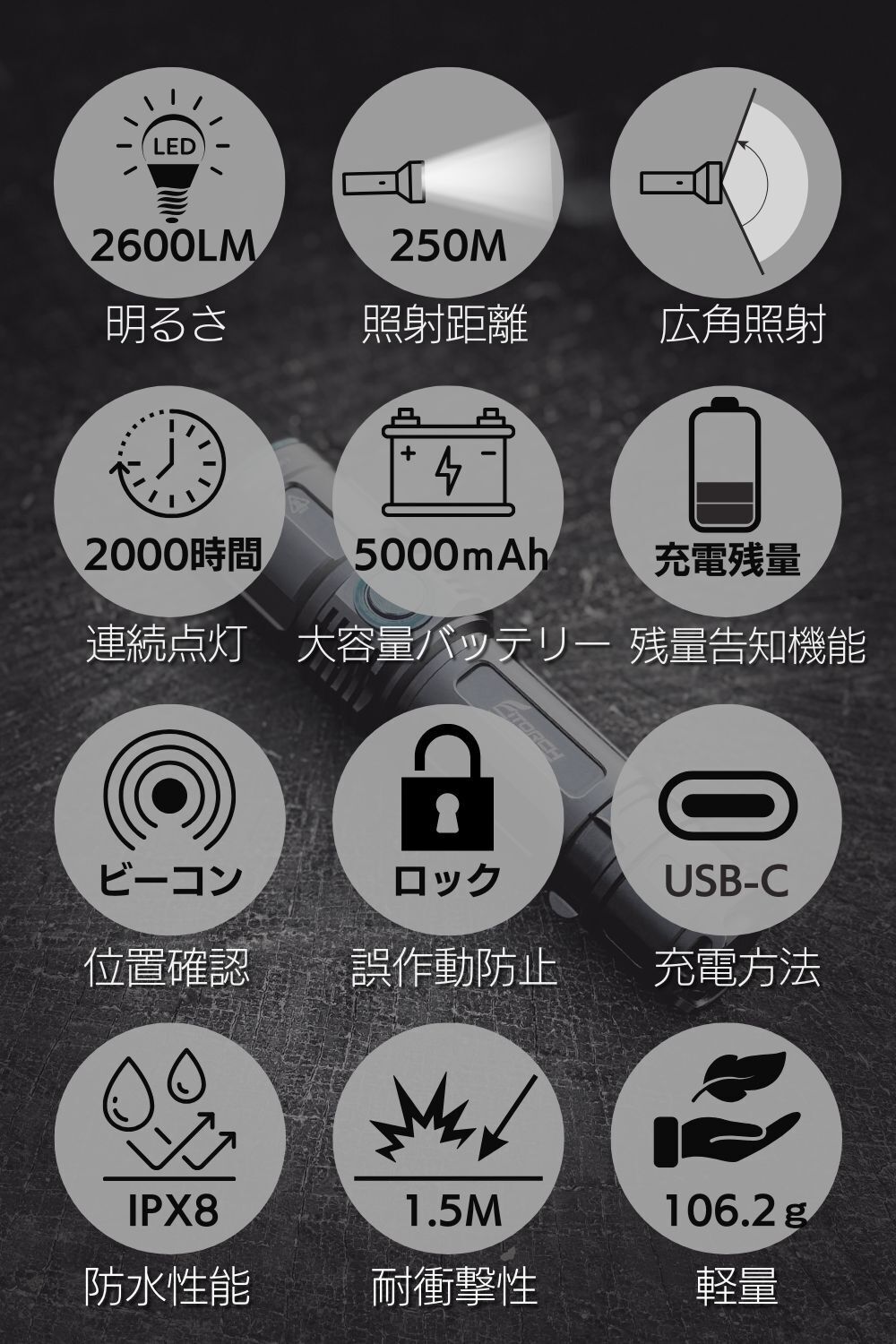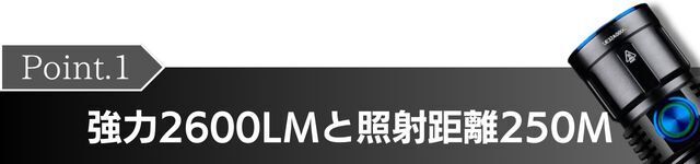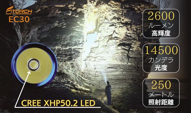 2600ルーメン&250m照射の超高輝度。CREE XHP50.2 LED搭載で、14500cdの圧倒的な明るさを実現。暗闇を昼間のように明るく照らします。