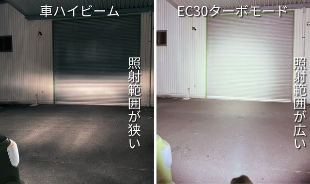 EC30は車のハイビームと比べても広角で照射範囲が広く、照射距離も250メートルで近くから遠くまで明るく照らすことが出来ます。