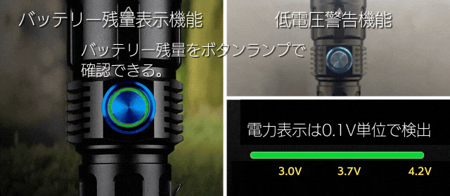 ・低電圧警告機能:充電が約3.0Vを切るとボタンが赤点灯します。