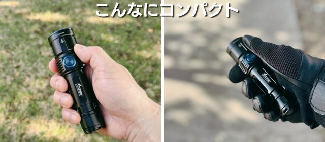 EC30はスリム設計で、手のひらに収まるサイズ感。ポケットやバッグにすっぽり収まり、持ち運びもラクラクです。また人間工学に基づく構造で、素手でもグローブでも滑りにくく握りやすい、グリップ性能も抜群です。
