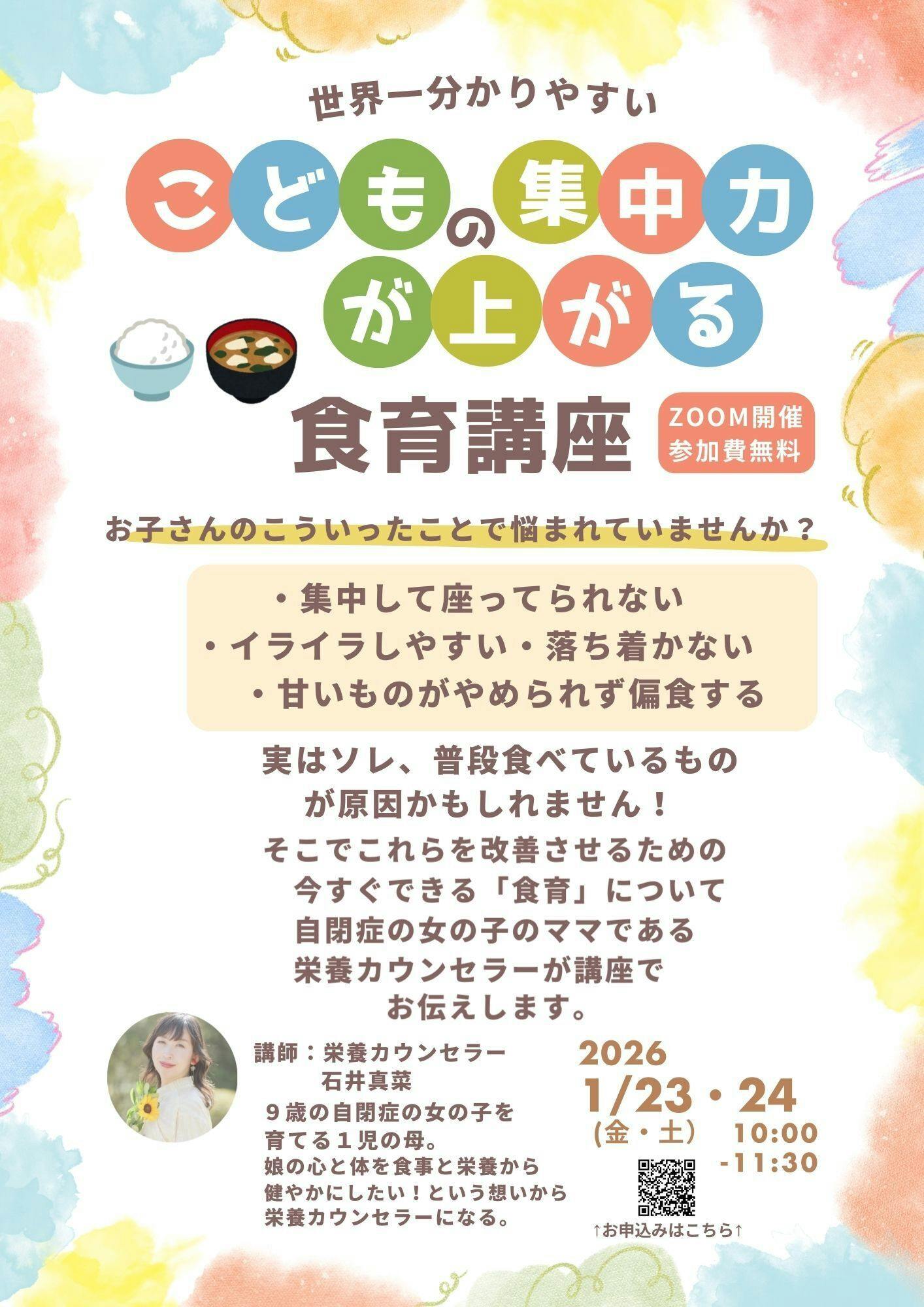 2025/12/03 17:31皆様、いつも温かい応援をありがとうございます。今回の食育講座開催のプロジェクトにつきまして、一緒に開催予定でした先生のご都合により開催日の変更をさせていただきました。そしてこの度、紆余曲折ありましたが食育講座開催日時が決まりましたので改めてご報告させていただきます。来年2026年1月23日(金)と24日(土)の 10:00〜11:30に開催いたします。タイトルが「こどもの集中力が上がる食育講座」になります。お母さんとお子さんが心身共に健やかになれる。そんな大切な「食」について多くの方に聴いてもらいたい!そんな想いから参加費は無料になります。今回集まった支援金でこちらのチラシ作成に使わせていただきます。ご支援してくださった皆様、本当にありがとうございました。また改めて詳しい内容などをご報告させていただきますので、どうぞよろしくお願い致します。いつもありがとうございます。 栄養カウンセラー 石井真菜 もっと見るお礼と近況報告