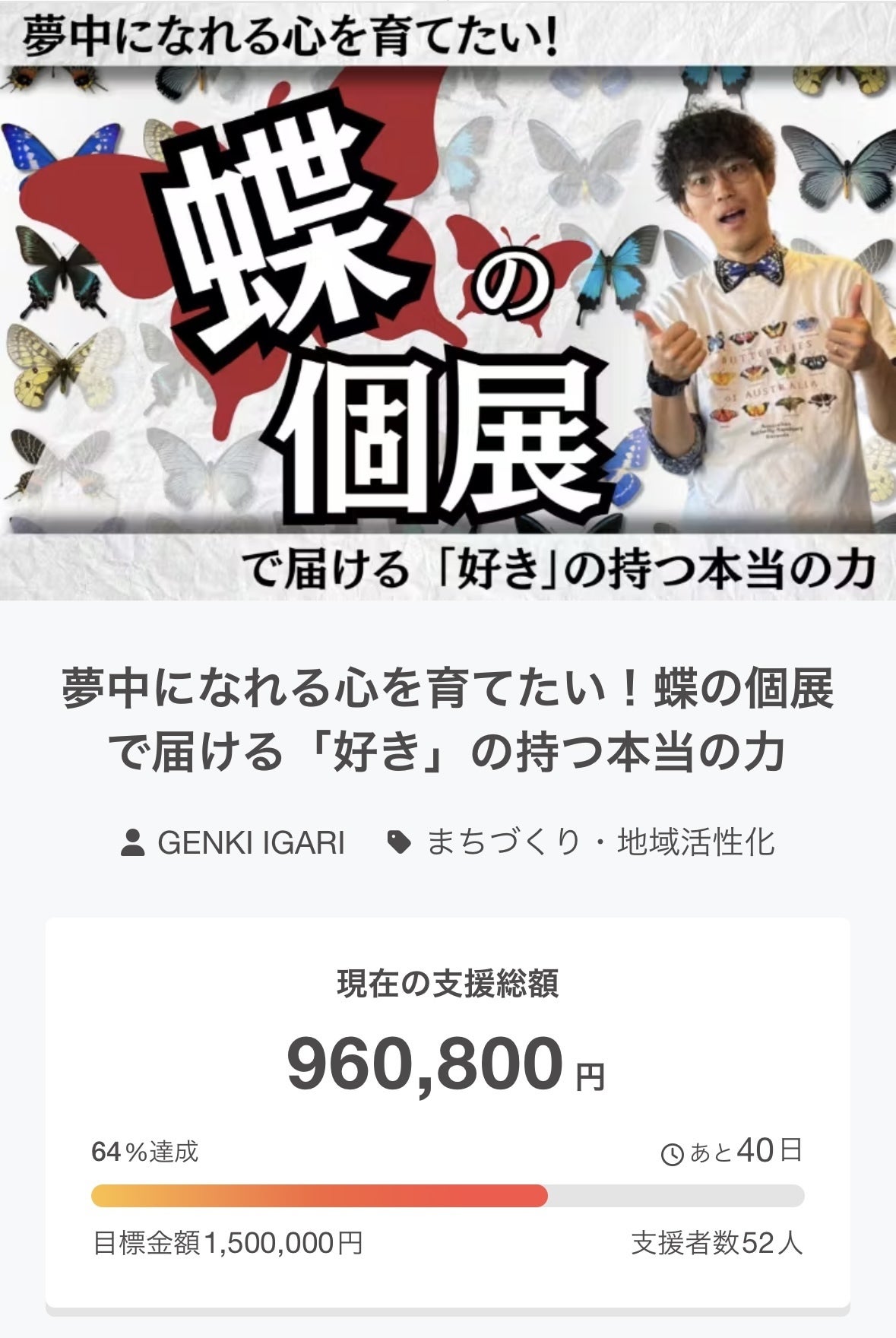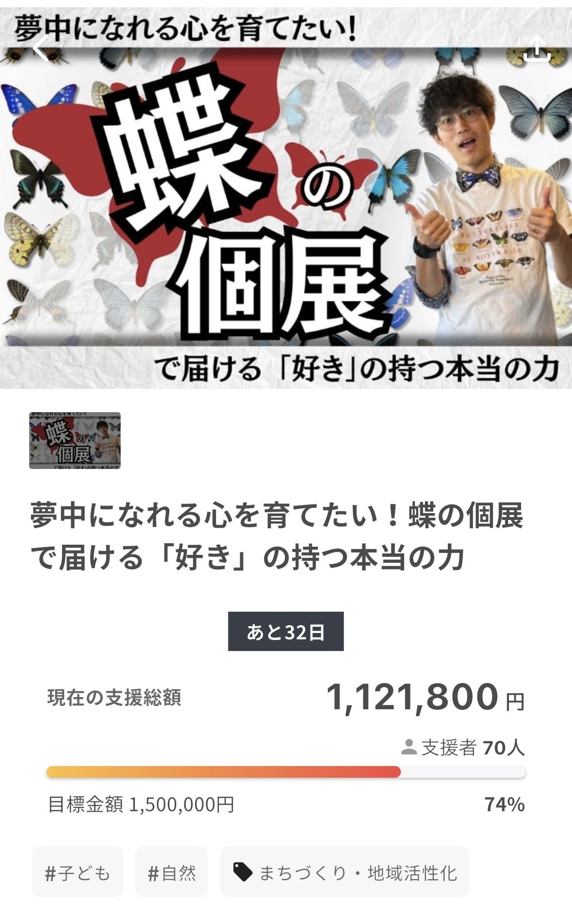 6/4(水)にプロジェクトを開始してからたくさんの応援本当にありがとうございます!おかげさまで初日に30%を超え、総合ランキングでは8位カテゴリランキングでは2位に入ることができました。これもみなさまの応援のおかげです。改めて御礼申し上げます。本当にありがとうございます!まだまだプロジェクトは道半ばです。あと4,9200円で大台の100万円です!こちらを是非とも6月中に達成したい!!!おすすめリターンはこちら【標本展示スポンサー】https://camp-fire.jp/projects/846942/backers/new?id=1418780是非、SNSなどでシェア、拡散いただけますと幸いです。夢中になる人がこんなにも輝くという世界を体現するためにもよろしくお願いいたします。蝶蒐集家:猪狩元気