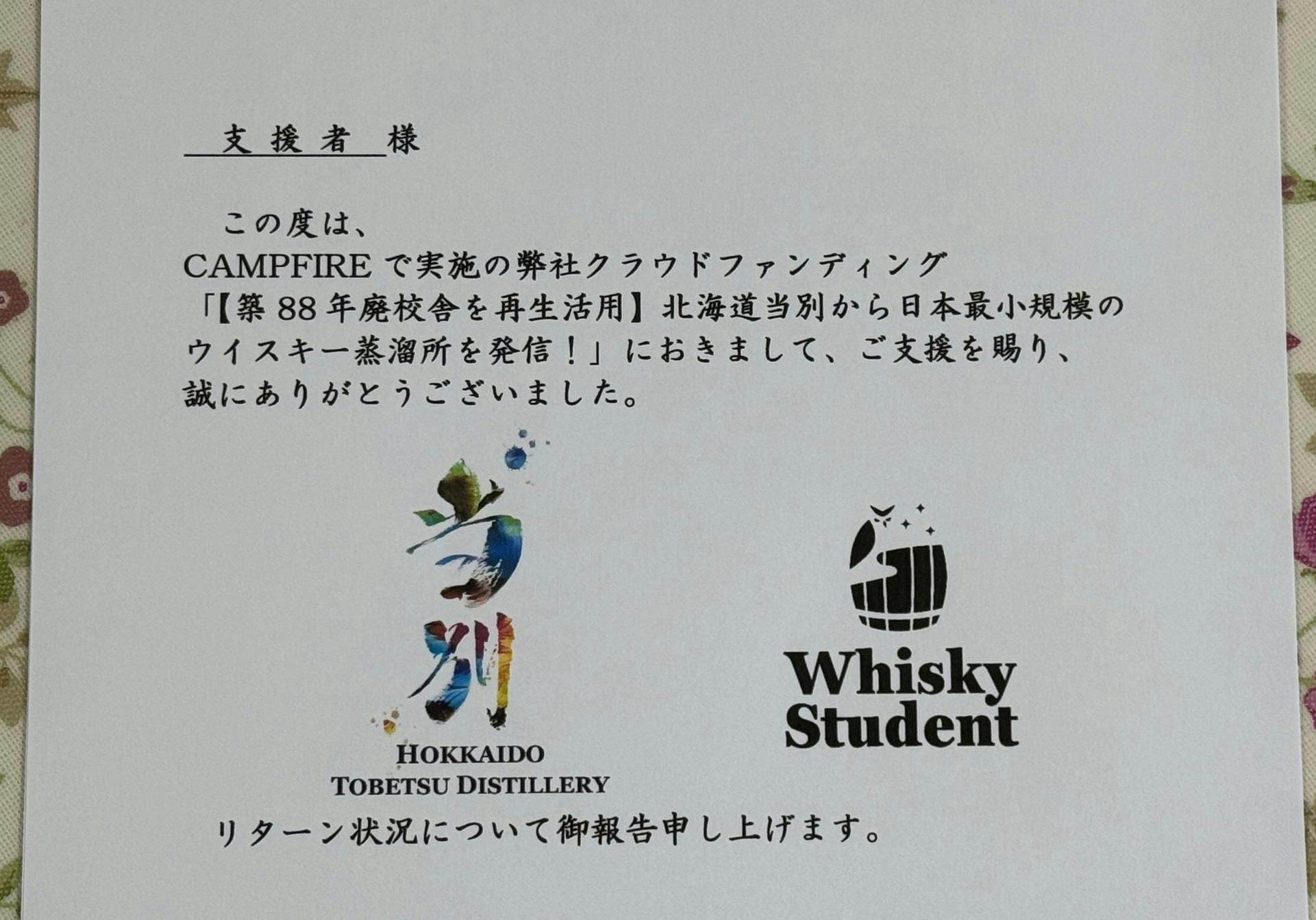 2025/11/19 15:12みなさまこんにちは。株式会社Whisky Student代表取締役の田中です。クラウドファンディングが終了直後の活動報告から、間が開いてしまいましたことをお詫び申し上げます。おかげさまで工事については現在のところ順調に進んでおり、支援者様に改めて感謝申し上げます。最近たまたま弊社とは関係のない他のクラウドファンディングで、終了後に音沙汰がなく不安がっておられる支援者を見ました。弊社クラウドファンディングにご支援いただいた皆さまも、もしかすると不安に思われているかもしれないと考え、現在(終了後40日時点)でのリターン状況について以下のとおり御報告いたします。(リターン掲載順は価格順です)①500円【Whisky Student公式サイト内の特設ページにお名前掲載】お届け予定:2025年11月→現在準備中です。③葉書と⑥コースターの発送終了後、本年2025年11月末にupすることを目標に進めております。②1,980円【燻製マカダミアナッツ30g×1】お届け予定:2026年04月→国産ウイスキー廃樽材の燻煙源については必要量を調達済み、当別町産泥炭の調達については検討中です。③3,000円【御礼葉書不定期便】お届け予定:2025年11月より開始で全5回→第一弾を印刷済み、本日11/19(水)宛名シールを印刷し完成次第発送の予定です。④3,850円《ロゴ入4色ボールペン+1》【軸に当別産ミズナラ樽材用木の端材を使用した、当別蒸溜所+Whisky Studentロゴ入り4色ボールペン+シャープペンシル】お届け予定:2026年09月→今週中に当別町産ミズナラ材の原木が製材される際に立ち会う予定です。⑤6,600円《オリジナルプリントTシャツ》【前面:当別蒸溜所題字/背面:Whisky Studentロゴ】お届け予定:2025年12月→品物を受け取って検品済み、満足の仕上がりです。発送分は完了、一部本年中にお会いする方には手渡しを検討しています。⑥13,200円《コラボ》【クラフト高級レザーコースター】お届け予定:2025年11月→品物を受け取って検品済み、カッコいい仕上がりにほれぼれとしております。BOTAマス様、誠にありがとうございました。現在発送準備中です。⑦16,500円《コラボ》【3回届く!絶品マリアージュショコラ】お届け予定:下記3回初回:2026年2~3月到着 賞味期限およそ2週間中間:2026年5~6月到着 賞味期限およそ3ヵ月最終:2027年2~3月到着 賞味期限およそ2週間→年内に先方へメール等でご連絡して進めてまいります。また、12月初旬に初回のショコラに用いるウイスキーのサンプルを入手予定です。⑧19,800円《コラボ》【ウイスキー樽熟成ノースアイランドビール330mL×2本 + 当別蒸溜所ニューボーン(☆)200mL×1本】お届け予定:2027年09月→年明けに先方との打合せを考えております。また、現在当別蒸溜所は建設工事(建物の改修工事)中、酒造免許取得についても申請準備中です。⑨22,000円【当別蒸溜所はじめてのニューメイクウイスキー15mL×2本】お届け予定:2026年09月→瓶などの包材や発送方法について検討中です。また、現在当別蒸溜所は建設工事(建物の改修工事)中、酒造免許取得についても申請準備中です。⑩24,200円《30本だけ!当別蒸溜所最速の3年熟成!一口カスクオーナー権》【当別蒸溜所のカスクNo.1に詰める原酒の共同オーナー権販売】お届け予定:2029年10月→瓶などの包材や発送方法について検討中です。また、現在当別蒸溜所は建設工事(建物の改修工事)中、酒造免許取得についても申請準備中です。⑪28,600円《契約農家さんのお米》【当別町内産ゆめぴりか5kg×4】お届け予定:2026年11月→発送済みです。⑫49,500円《スペシャル企画》【シングルモルトジャパニーズウイスキー「INCH OBORO」 シングルカスク 5年熟成品 700mL×1本】お届け予定:2027年02月→12月初旬に現時点でのウイスキーのサンプルを入手予定です。⑬50,000円【芳名版記載(半分サイズ)】お届け予定:2026年08月→旧弁華別小学校のもとの材のうち撤去部分から状態の良いものを確保致しました。設計担当者と実際の展示箇所や方法について検討中です。⑭77,000円《10/21(火)限定イベント!現場見学会/昼食会/事業説明会》【当別蒸溜所建設工事現場見学+コース料理とウイスキーペアリング+当別蒸溜所プロジェクト説明会】お届け予定:2025年10月→実施済みです。ご参加いただいた方からは大変好評でした。⑮100,000円【芳名版記載】お届け予定:2026年08月→旧弁華別小学校のもとの材のうち撤去部分から状態の良いものを確保致しました。設計担当者と実際の展示箇所や方法について検討中です。⑯110,000円《多数決で条件を選ぶStudent合同製造見学体験》【①製造条件を多数決で選択 ②決められた日程で当別蒸溜所に来場できる方が製造を見学orちょっと体験 ③当該ロットシングルカスク700mLボトル2本分のオーナー権利】お届け予定:2027年05月→現在当別蒸溜所は建設工事(建物の改修工事)中、酒造免許取得についても申請準備中です。本リターンのご支援者様には、2026年の製造開始直後から、リターン分の製造条件を詰めるためのご連絡を開始する予定です。⑰120,000円【ウォッシュバッ