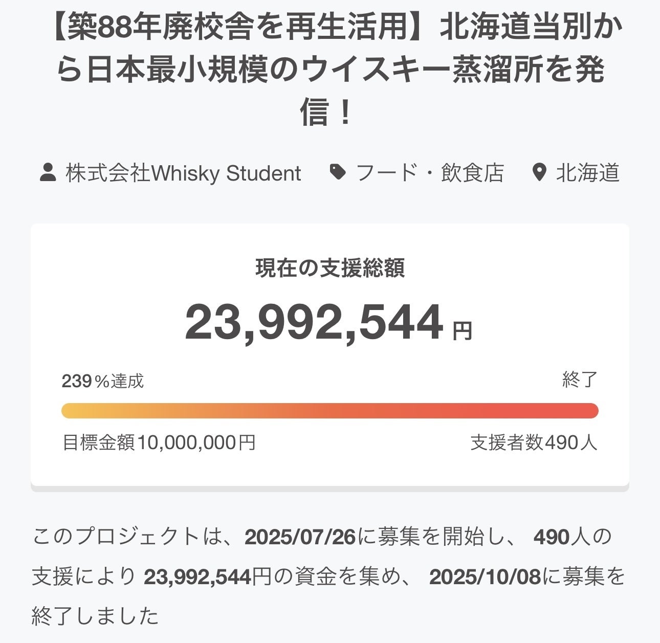 みなさまこんにちは。株式会社Whisky Student代表取締役の田中です。前回の活動報告から、間が開いてしまいましたことをお詫び申し上げます。おかげさまで工事は順調に進んでおり、支援者様に改めて感謝申し上げます。来月には建物改修工事が完了し、その後は8月製造開始を目指して5月から設備の搬入と据付工事を開始する予定です。2026年2月25日現在でのリターン状況について、以下のとおり御報告いたします。(リターン掲載順は価格順です)①500円【Whisky Student公式サイト内の特設ページにお名前掲載】→実施済②1,980円【燻製マカダミアナッツ30g×1】お届け予定:2026年04月→当別町産泥炭は4月上旬に予定地の掘削を行う予定です。③3,000円【御礼葉書不定期便】お届け予定:2025年11月より開始で全5回→第一弾は実施済、第二弾は改修工事引渡し後の予定です。④3,850円《ロゴ入4色ボールペン+1》【軸に当別産ミズナラ樽材用木の端材を使用した、当別蒸溜所+Whisky Studentロゴ入り4色ボールペン+シャープペンシル】お届け予定:2026年09月→製材・乾燥された当別町産ミズナラの端材を本日加工会社に発送しました。⑤6,600円《オリジナルプリントTシャツ》【前面:当別蒸溜所題字/背面:Whisky Studentロゴ】→実施済⑥13,200円《コラボ》【クラフト高級レザーコースター】→実施済⑦16,500円《コラボ》【3回届く!絶品マリアージュショコラ】お届け予定:下記3回初回:2026年2~3月到着 賞味期限およそ2週間中間:2026年5~6月到着 賞味期限およそ3ヵ月最終:2027年2~3月到着 賞味期限およそ2週間→現在初回の試作中です。トップ画像をご覧ください。3月発送予定です。⑧19,800円《コラボ》【ウイスキー樽熟成ノースアイランドビール330mL×2本 + 当別蒸溜所ニューボーン(☆)200mL×1本】お届け予定:2027年09月→酒造免許申請準備中で、3月上旬までに申請予定です。⑨22,000円【当別蒸溜所はじめてのニューメイクウイスキー15mL×2本】お届け予定:2026年09月→瓶と充填方法についてはほぼ決めました。酒造免許については申請準備中で、3月上旬までに申請予定です。⑩24,200円《30本だけ!当別蒸溜所最速の3年熟成!一口カスクオーナー権》【当別蒸溜所のカスクNo.1に詰める原酒の共同オーナー権販売】お届け予定:2029年10月→瓶などの包材や発送方法について検討中です。酒造免許については申請準備中で、3月上旬までに申請予定です。⑪28,600円《契約農家さんのお米》【当別町内産ゆめぴりか5kg×4】→実施済⑫49,500円《スペシャル企画》【シングルモルトジャパニーズウイスキー「INCH OBORO」 シングルカスク 5年熟成品 700mL×1本】お届け予定:2027年02月→昨年12月初旬に熟成4年時点でのウイスキーのサンプルを入手しました。中の人は期待以上の香味に興奮を覚えました。⑬50,000円【芳名版記載(半分サイズ)】お届け予定:2026年08月→旧弁華別小学校のもとの材のうち撤去部分から状態の良いものを確保済みです。入口からはいってすぐ左に展示場所を作る予定です。⑭77,000円《10/21(火)限定イベント!現場見学会/昼食会/事業説明会》【当別蒸溜所建設工事現場見学+コース料理とウイスキーペアリング+当別蒸溜所プロジェクト説明会】→実施済⑮100,000円【芳名版記載】お届け予定:2026年08月→旧弁華別小学校のもとの材のうち撤去部分から状態の良いものを確保済みです。入口からはいってすぐ左に展示場所を作る予定です。⑯110,000円《多数決で条件を選ぶStudent合同製造見学体験》【①製造条件を多数決で選択 ②決められた日程で当別蒸溜所に来場できる方が製造を見学orちょっと体験 ③当該ロットシングルカスク700mLボトル2本分のオーナー権利】お届け予定:2027年05月→酒造免許については申請準備中で、3月上旬までに申請予定です。本リターンのご支援者様には、2026年の製造開始直後から、リターン分の製造条件を詰めるためのご連絡を開始する予定です。⑰120,000円【ウォッシュバック命名権】お届け予定:2026年08月→動きがあるのは7月ごろになるかと思います。⑱154,000円《違いを感じるミニ樽2種のStudentキット》【ミニ樽1.5L×2種 + 当別蒸溜所ニューメイク3L×2種】お届け予定:2026年10月→樽サプライヤーと打合せして納期や数量の調整をしました。酒造免許については申請準備中で、3月上旬までに申請予定です。⑲200,000円【簡易電動フォークリフト命名権】お届け予定:2026年08月→導入のための準備を進めております。次のアクション時期等の目途がつきましたら個別のご連絡を致します。⑳250,000円【電動フォークリフト命名権】お届け予定:2026年08月→導入のための準備を進めております。次のアクション時期等の目途がつきましたら個別のご連絡を致します。㉑550,000円《原酒を選べる小ミズナラ樽のStudentキット》【北海道産ミズナラ樽30L×1 + 当別蒸溜所ニューメイク4タイプ以上から合計30L(選定用先行サンプル30mL×4タイプ以上)】お届け予定:2027年02月→樽サプライヤーと打合せして納期や数量の調整をしました。酒造免許については申請準備中で、3月上旬までに申請予定