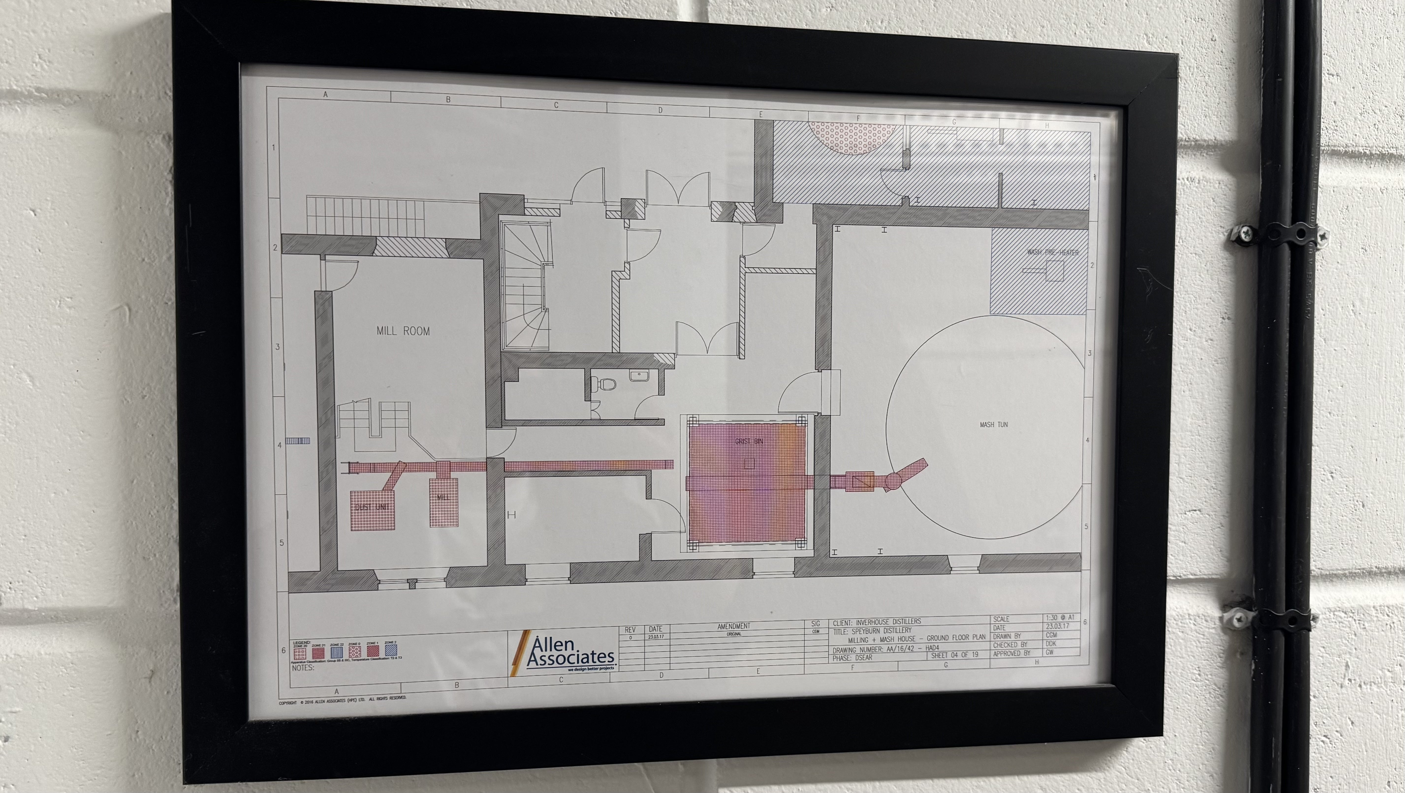2つ目は、蒸溜所内各所に建築図面の平面図が貼ってあったこと。
