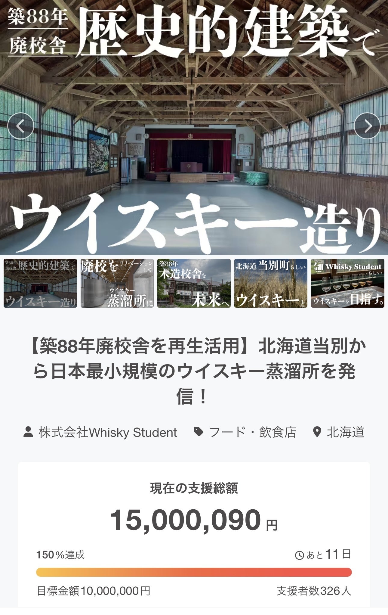 本日、本クラウドファンディング「【築88年廃校舎を再生活用】北海道当別から日本最小規模のウイスキー蒸溜所を発信!」に頂いた支援総額がネクストゴールの1500万円を突破しました!
