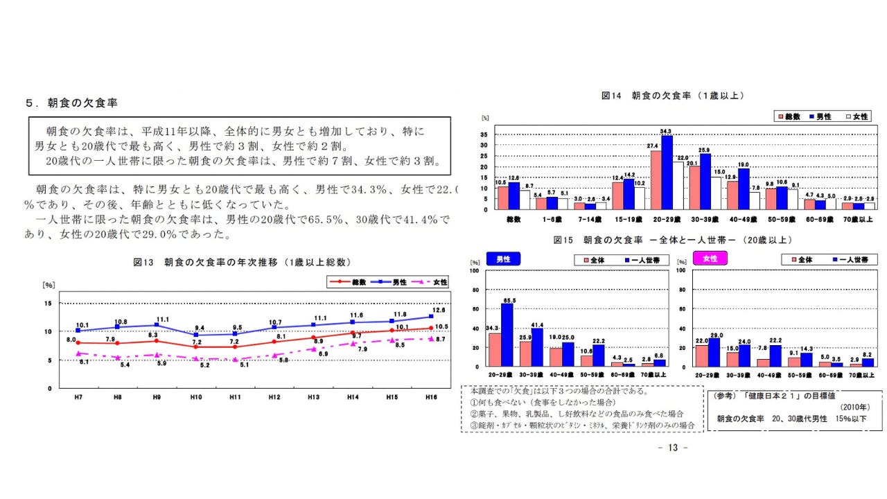 上のグラフは厚生労働省調べの朝食欠食率についての説明です。