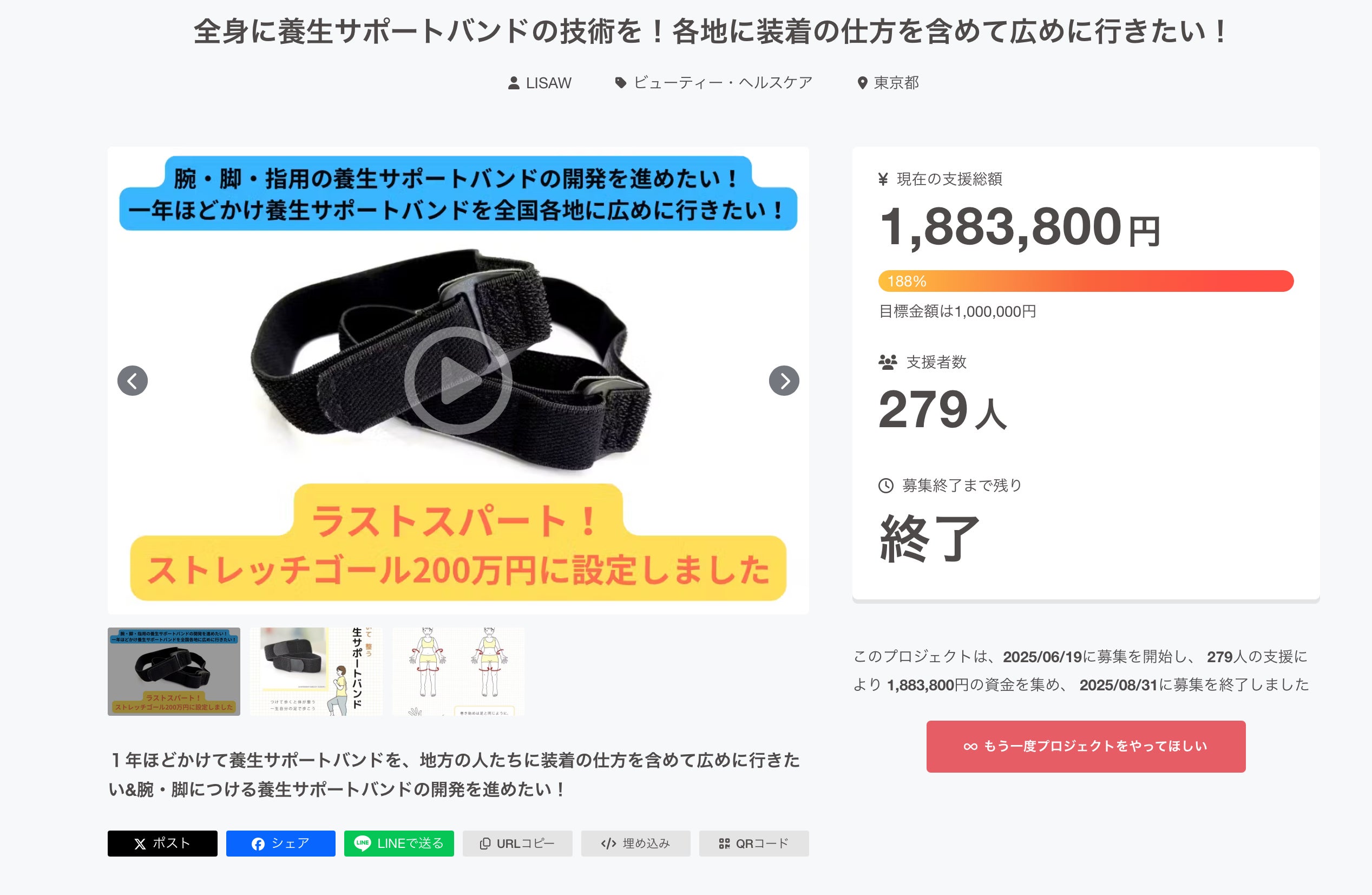 このプロジェクトは、2025/06/19に募集を開始し、 279人の支援により 1,883,800円の資金を集め、 2025/08/31に募集を終了しました